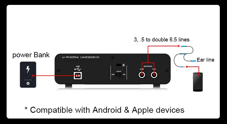 Чтобы подключить мобильный телефон самостоятельно, вам необходимо использовать банк питания для питания, или вы можете выбрать подключение к компьютеру для источника питания (компьютерный терминал может использоваться как вход или выход, И эффект компьютерной стойки может быть выведен на мобильный телефон live room)