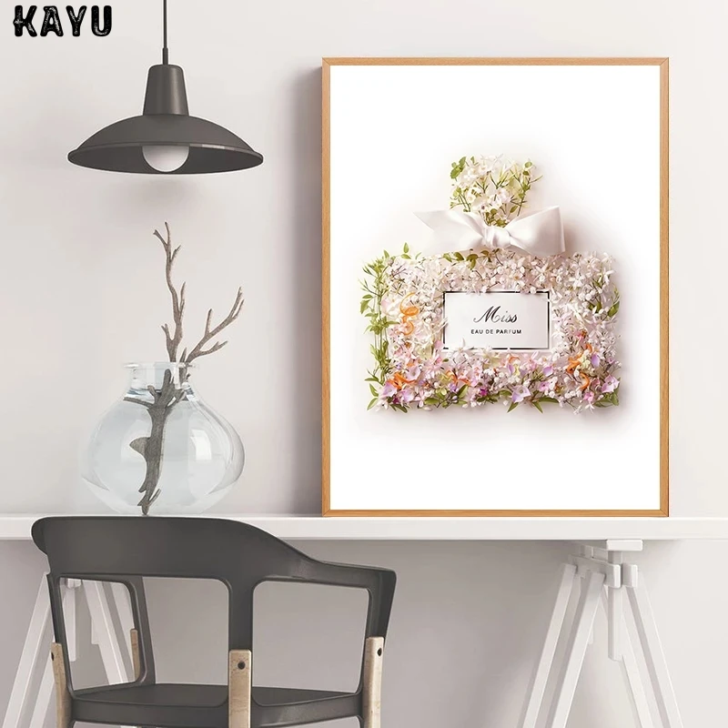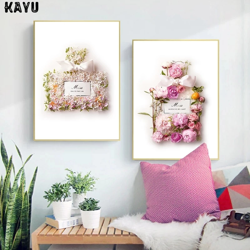 Модные Розовые постеры и принты флакона духов и цветов, Роскошный декор, букет мисс цветущей, модные картины, Картина на холсте