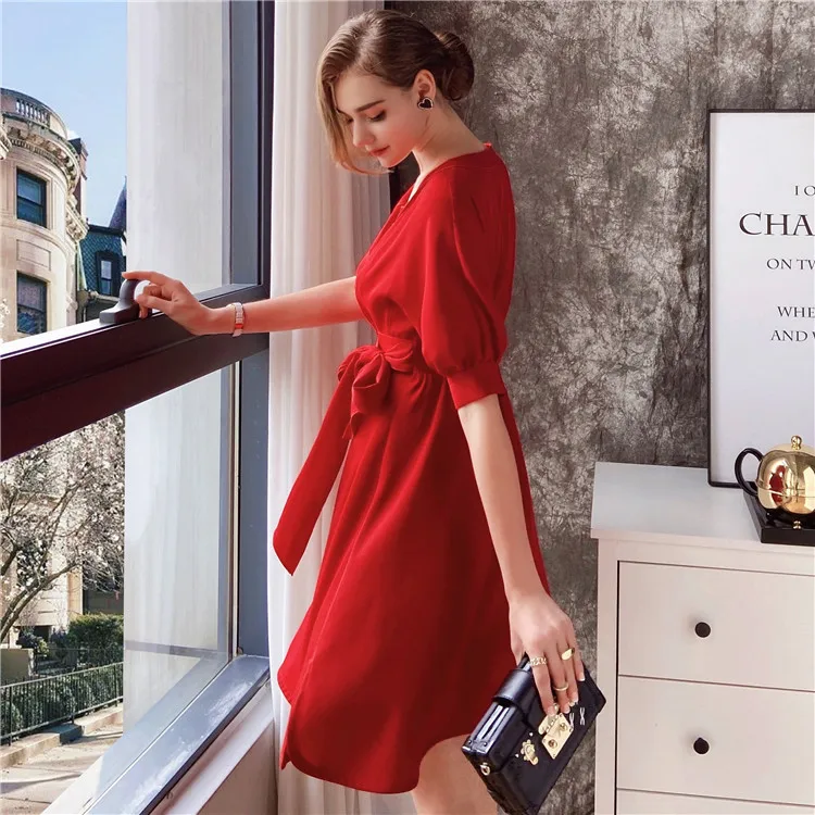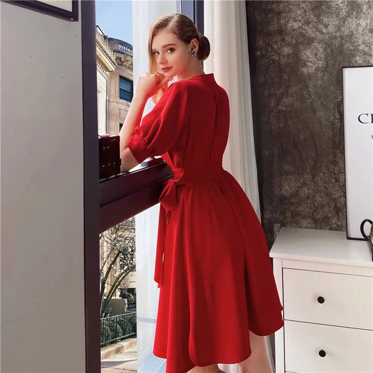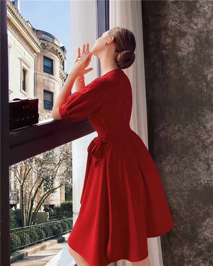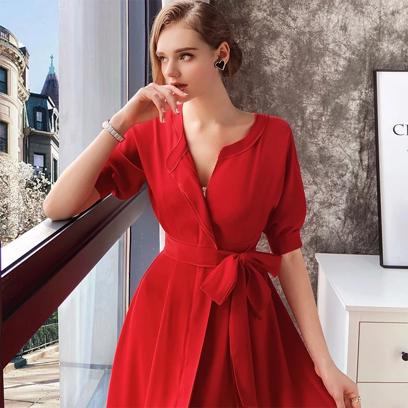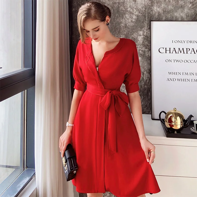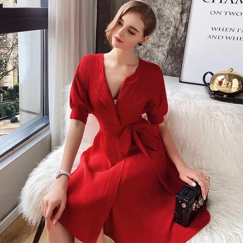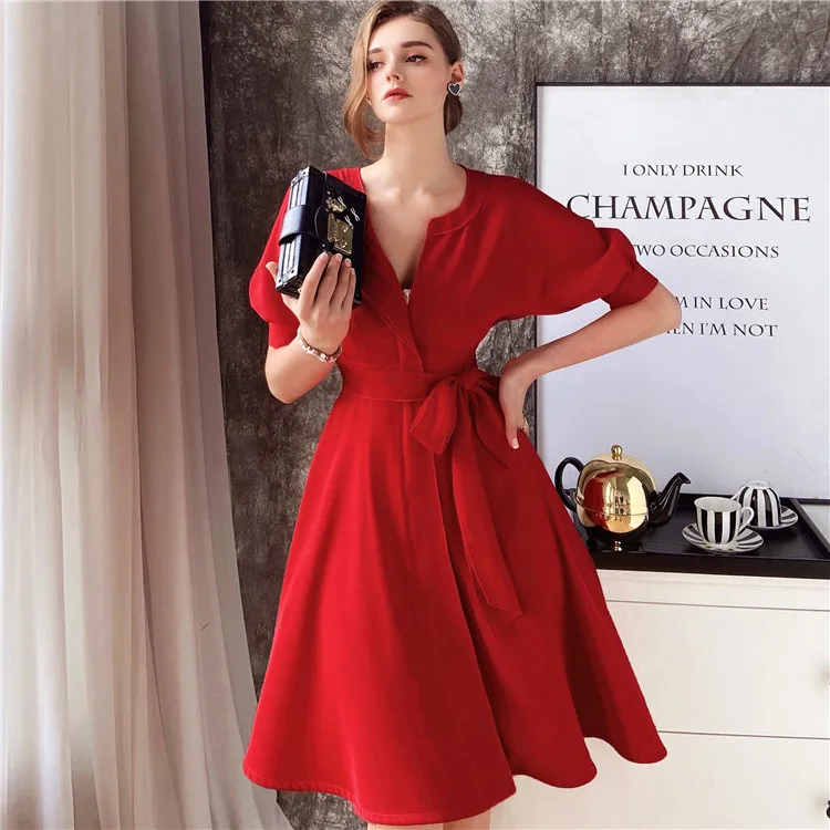 Женское винтажное платье-трапеция Dabuwawa, красное платье с рукавами летучая мышь, V-образным вырезом и разрезом на подоле, DO1BDR043, однотонное вечернее платье