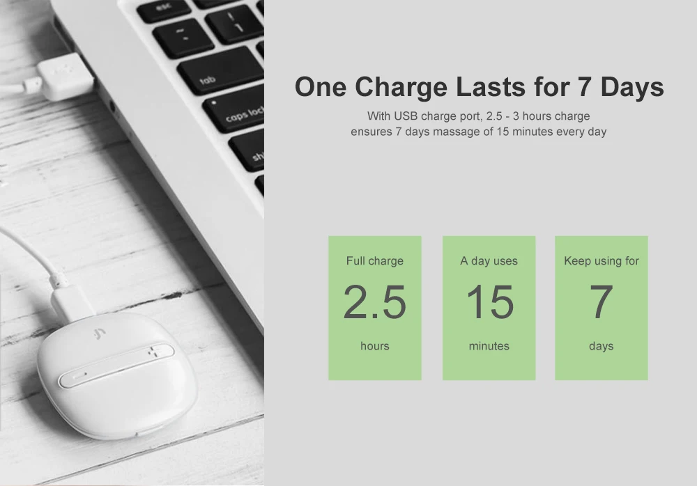 С usb-порт для зарядки, 2,5-3 часа зарядки обеспечивает 7 дней массажа 15 минут каждый день