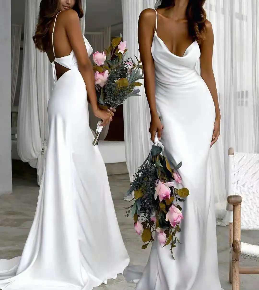 Длинные Cowel декольте белое свадебное платья для женщин пикантные крест накрест сзади атласная Abendkleider свадебное платье макси платья для женщин