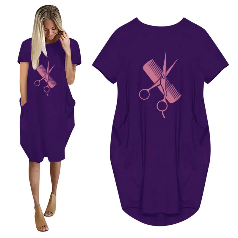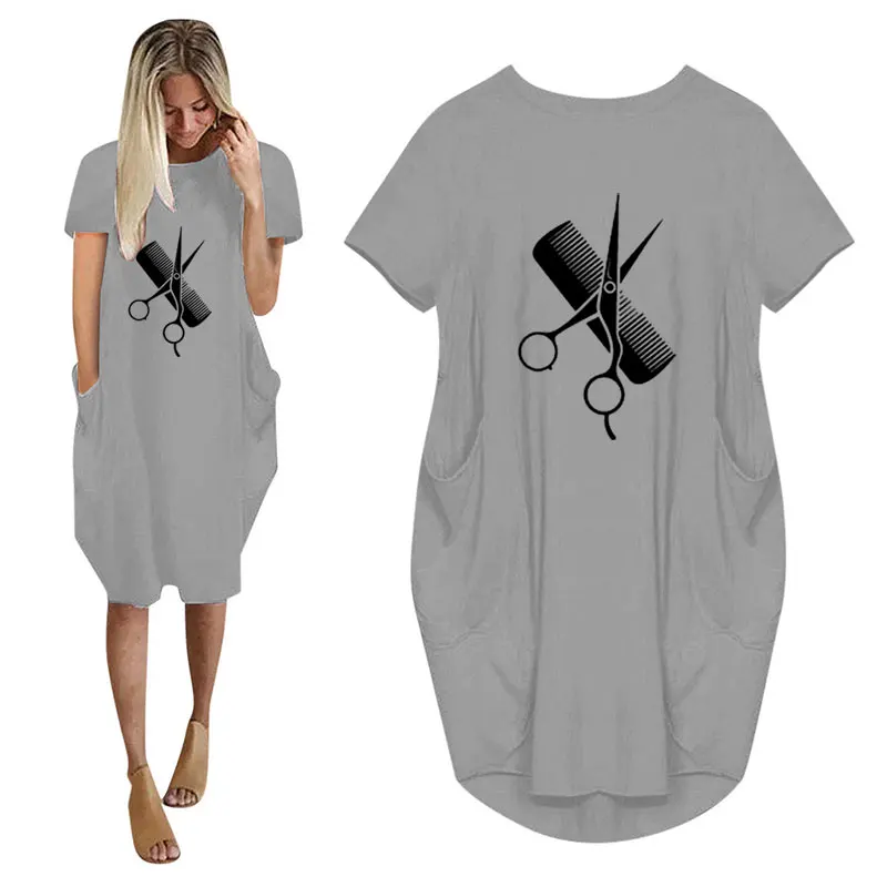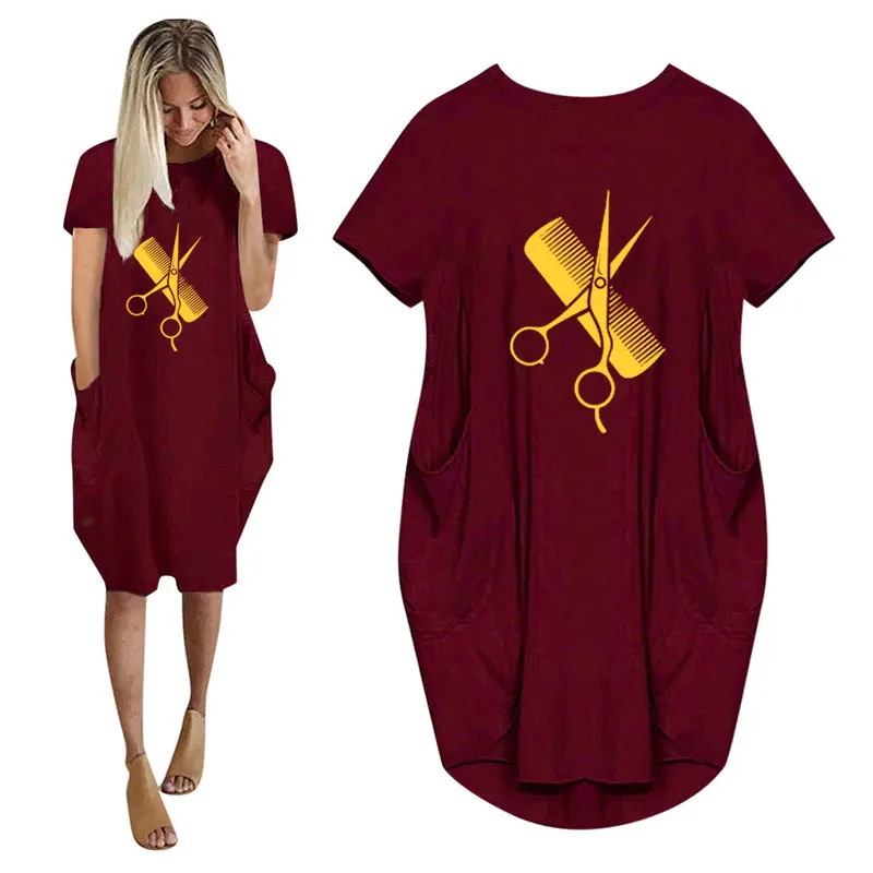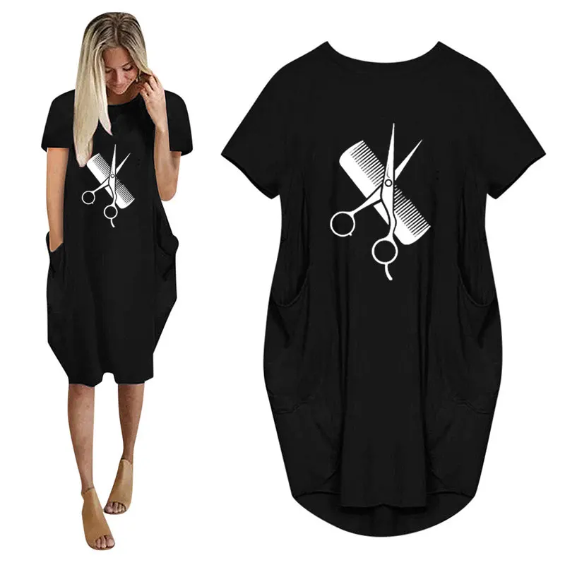 Женское длинное платье-рубашка, с принтом ножниц и расчесок, с карманом