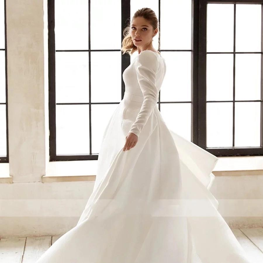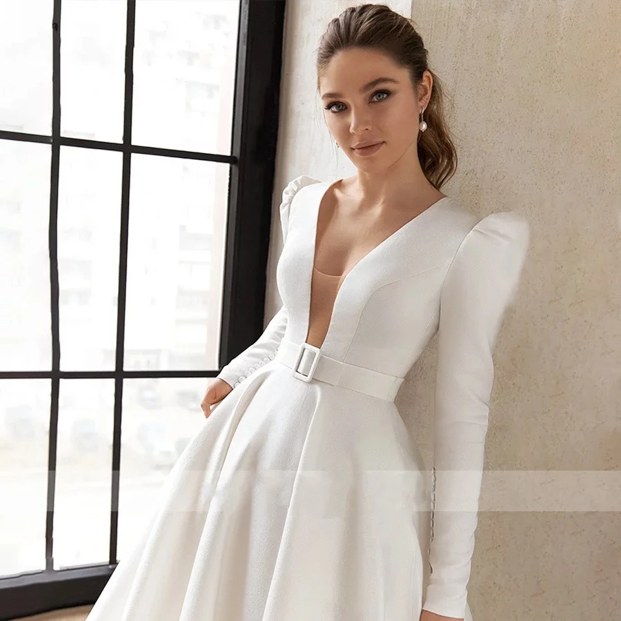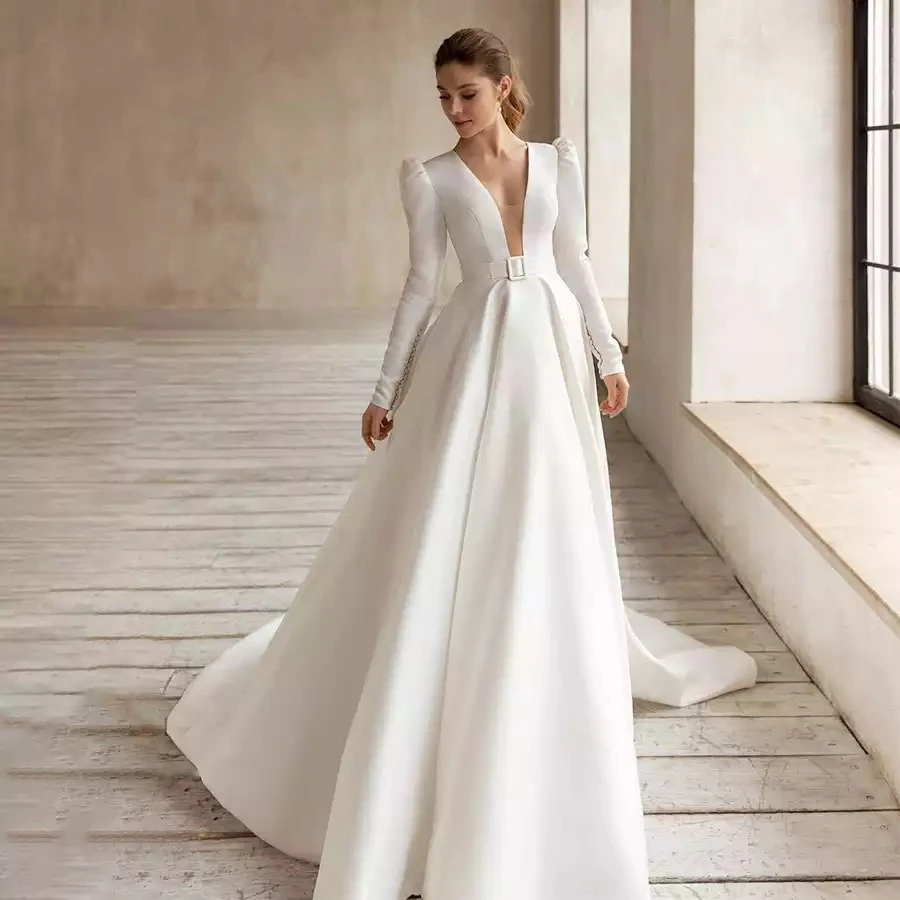 Женское атласное платье с поясом, элегантное платье в пол цвета слоновой кости с длинным рукавом, глубоким V-образным вырезом, на молнии и пуговицах, свадебное платье, 2021