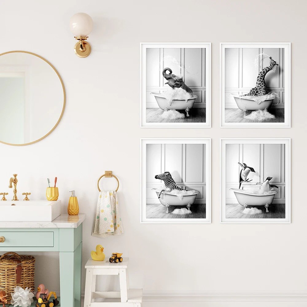 Забавный плакат с жирафом, слоном, зеброй, пингвинами в ванне, картина для детской комнаты в скандинавском стиле, Картина на холсте, настенные художественные принты, декор для ванной и туалета