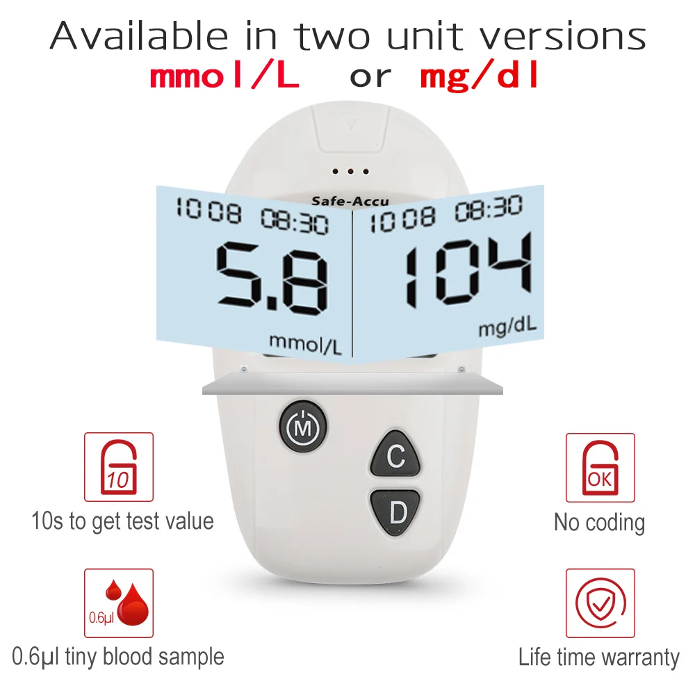 1. Есть 2 дополнительных устройства-mmol/L & mg/dL, пожалуйста, выберите его в соответствии со стандартом в вашей стране.