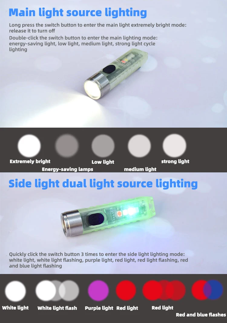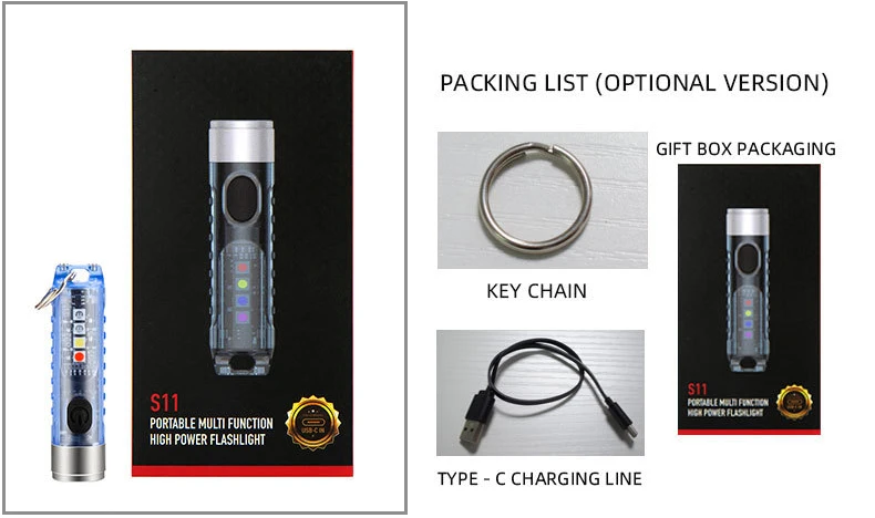Описание товара S11 сильный факел, мини и изысканный, компактный и портативный; Бочка такая же тонкая, как и мизинец, и весит всего 18 г. Его можно повесить на цепочку с нулевой нагрузкой и легко носить с собой; Чрезвычайно яркий режим яркости 400лм, энергосберегающий режим работы от батареи 32 часа, удовлетворяющий потребности в освещении в реальном времени; Боковая лампа имеет фиолетовый светильник, который используется для ежедневной проверки валюты или обнаружения флуоресцентного агента; Задняя часть имеет функцию Магнитного Всасывания, в сочетании с предупреждающей мигающей передачей боковой светильник, адсорбируется на крыше и других местах и становится аварийным сигнальным инструментом светильник; Встроенный полимерный литиевый аккумулятор 300 мАч, через интерфейс Type-C, может быть полностью заряжен за 35 минут; Этот продукт интегрирует различные практические функции; Это идеальный ежедневный портативный мини-инструмент освещения Параметры продукта Модель источника: светильник luminus_SST20 Яркая степень: 400 лм Цветовая температура: 6500K Материал изделия: нержавеющая сталь PC + 304 Размер продукта: 15,6*60,5 мм Вес нетто: 18 г (один фонарик) Вес брутто: 62 г (фонарик + зарядный кабель, брелок, упаковка) Модель батареи: полимерная литиевая батарея Емкость аккумулятора: 300 мАч Характеристики порта зарядки: TYPE-C Время зарядки: 35 минут Входное напряжение: 5 В, входной ток: 500 мА · ч Защита от избыточного заряда благодаря: 4,25 V, защита от разрядки: 3,0 V Индикатор зарядки: ярко-красный во время зарядки, ярко-зеленый при полном заряде Индикация разряда: 100% * 15% загорается зеленым, менее 15% загорается красным Водонепроницаемость: IP65 Защита от ударов при падении высота: 1,5 м Среда использования: -10 ℃ ~ 40 ℃ Размер цветной коробки: 122,5*63,8*22 мм Основной светильник: функция положения шестерни очень яркий файл с высокой яркостью файл средней яркости файл с низкой яркостью файл энергосберегающий файл Время выдержки: 2 ч 130 минут в течение 4 ч 32 ч Яркость: 400LM/300LM/87LM/25LM/2LM Основной светильник Режим управления: Чрезвычайно яркий режим: «выключение, длительное нажатие, чтобы включить, отпустите его, чтобы выключить» Постоянный светильник: «дважды нажмите, чтобы включить, нажмите, чтобы переключиться, нажмите и удерживайте, чтобы выключить, с функцией памяти (в следующий раз, когда вы включите его, введите шестерню перед выключением)" Боковой светильник: шестереночный функциональный белый светильник/белый светильник мигающий/фиолетовый светильник/красный светильник мигающий/красный и синий мигающий попеременно Срок службы батареи: 133 минуты/112 минут/90 минут/125 минут/140 минут/160 минут Яркость: 50LM /////// Режим управления боковой светильник: три нажатия для включения, одно нажатие для переключения, длительное нажатие для выключения, с функцией памяти (через 3 минуты постоянный светильник, память перед выключением) Этот продукт не оснащен зарядной головкой. Для зарядки Используйте обычное зарядное устройство 5 В. Можно заряжать обычный мобильный телефон. Зарядные устройства с выходным напряжением выше 5 в не могут быть использованы.
