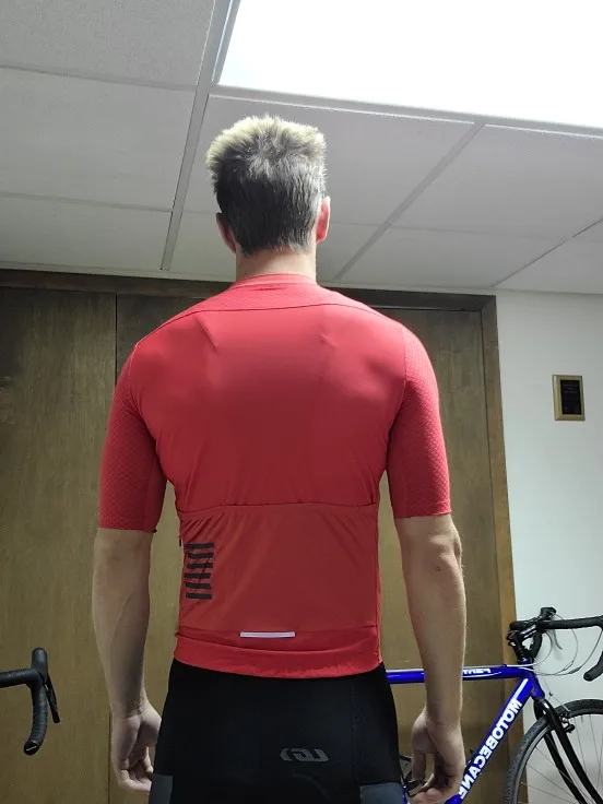 Super, je viens de l’enfiler et top je suis déjà à l'aise dans ma nouvelle tenue d'été de vélo. Le short avec bretelles est bien ajusté, le patch de protection des fesses est épais et isole bien de la selle. Il est très couvrant aussi devant. Les bretelles sont fines et légères et forment un joli dessin. La veste à manches courtes est bien ajustée elle aussi, le zip fonctionne bien je peux le manipuler facilement en roulant. La matière du tissu est douce légère et confortable. Un bel ensemble pour l'été et l’automne