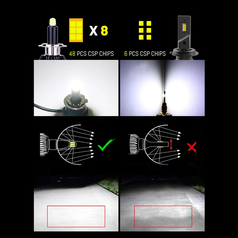 (1) светодиодная фара 25000лм/пара, каждая лампа 12500лм, супер яркая. (2) один светильник имеет 8 сторон 48 шт. чипов CSP, 360 градусов светильник ing. (3) Этот продукт 6500k, чисто белый светильник. (4) Мощность этого продукта составляет 50 Вт/пара, каждая лампа 25 Вт.