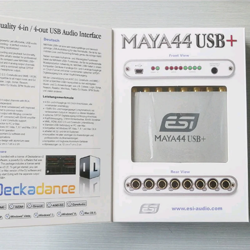 Аудиоинтерфейс Maya44 USB + от ESI/Ego Sys оснащен 4 входами RCA, 4 выходами RCA и выходом для наушников 1/8 "combo S/PDIF. Он совместим с DJ и профессиональным программным обеспечением для записи на компьютерах Mac и PC.