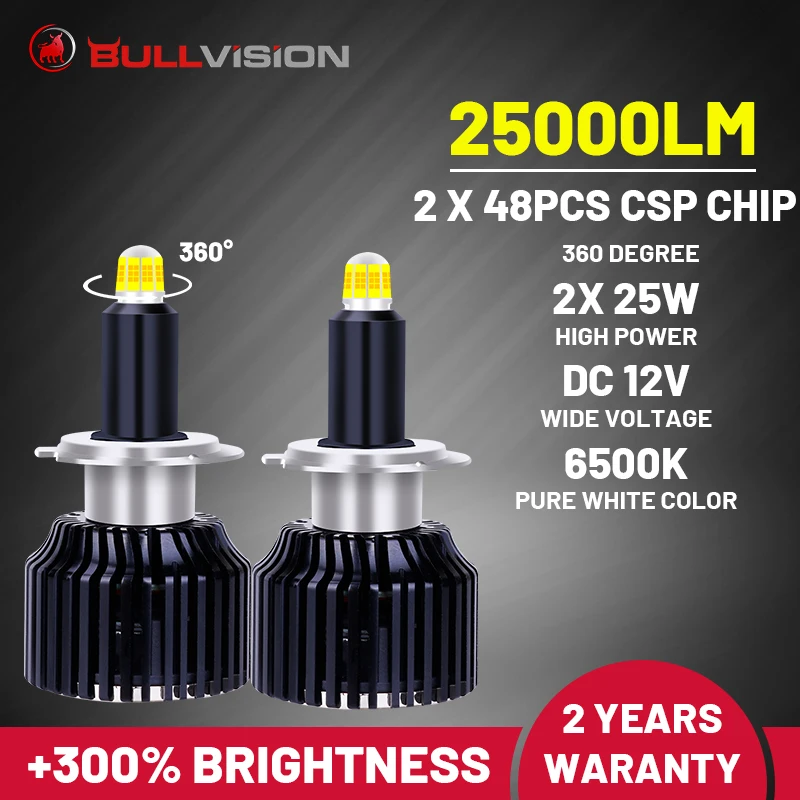Светодиодные фары Bullvision H7 H1, точечные светильники для авто, 25000Lm H8 H9 h11 Hb4 9006 Moto Hb3 9005 9012 Hir2, светодиодсветодиодный автомобильные лампы 360 градусов