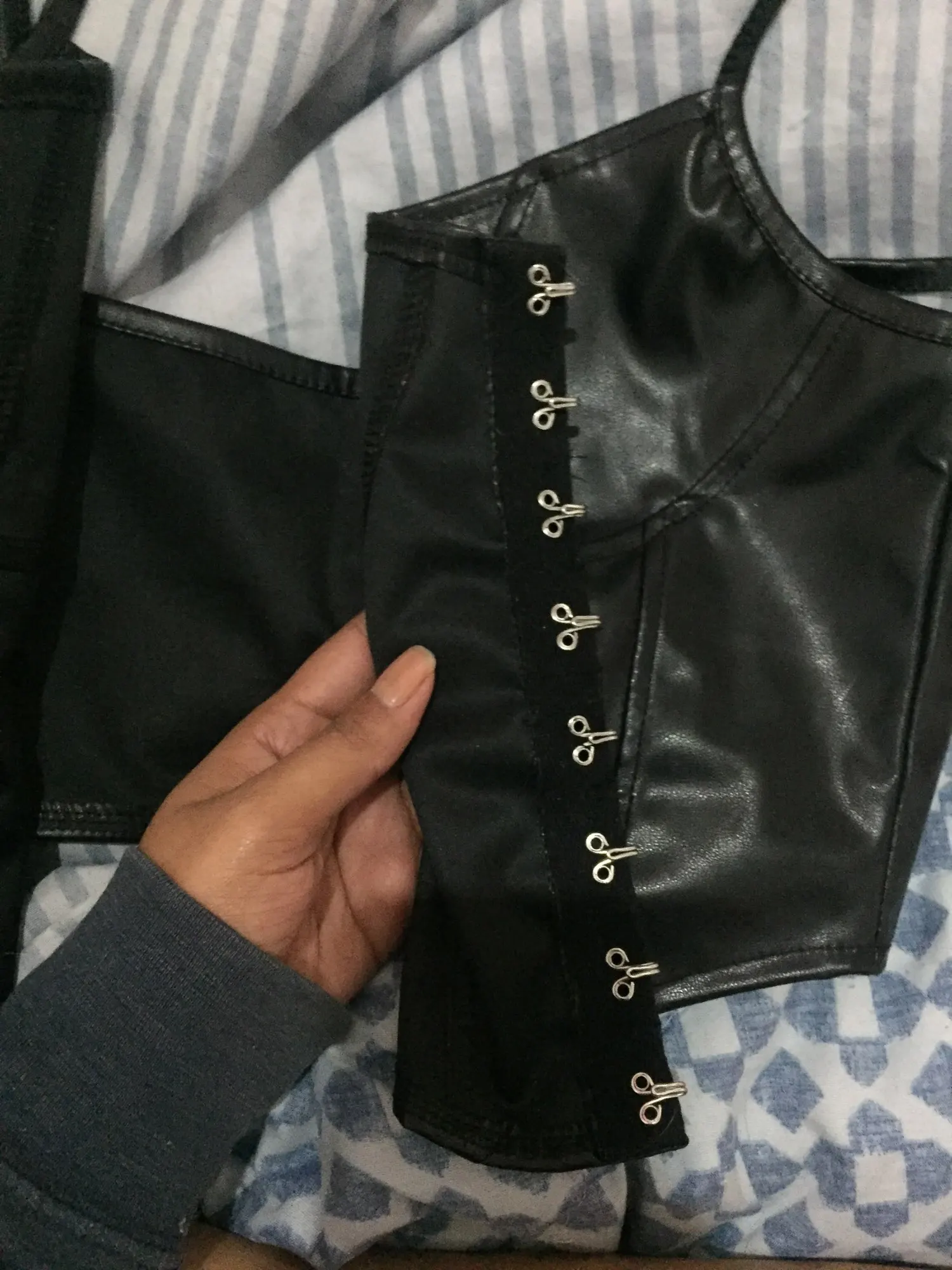 Ткань из высококачественной эластичной искусственной кожи, в состав входит 55% хлопка, 45% спандекса, чистая ручная работа, прочная и тонкая строчка. Аксессуары изготовлены из высококачественного двойного ряд крючков, Они невидимы и прочны