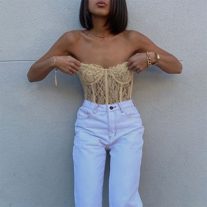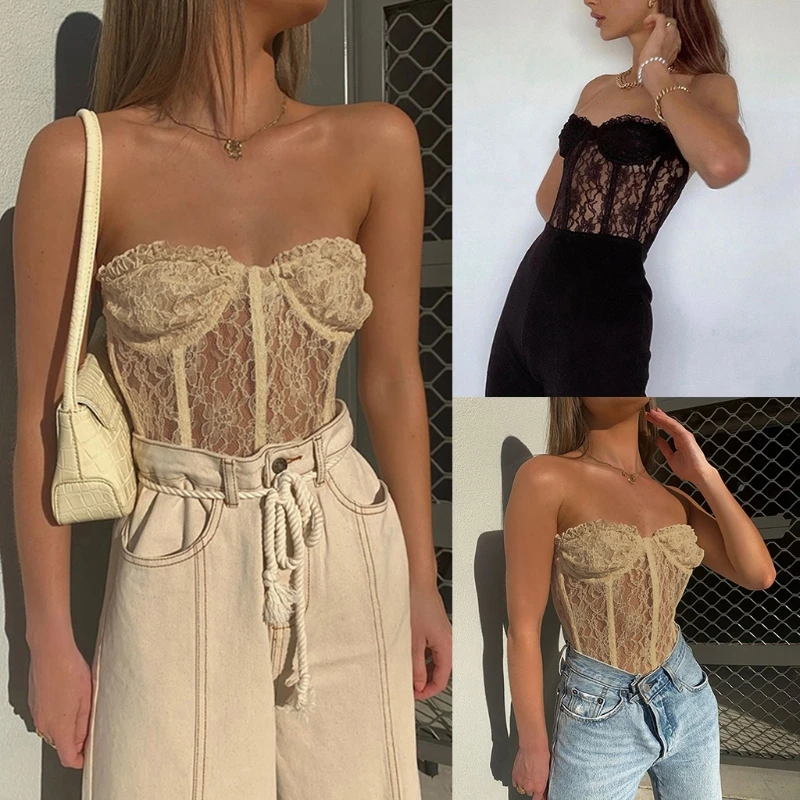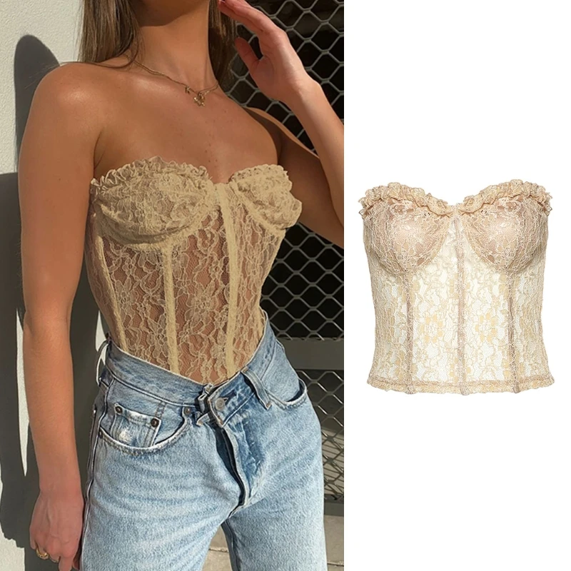 Женский сексуальный прозрачный корсет без бретелек с открытыми плечами, сетчатый укороченный топ с оборками и цветочным кружевом, Клубные вечерние бюстье с открытой спиной