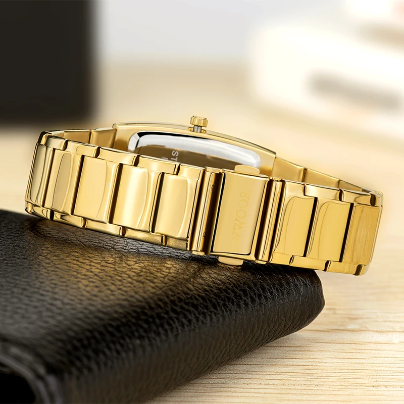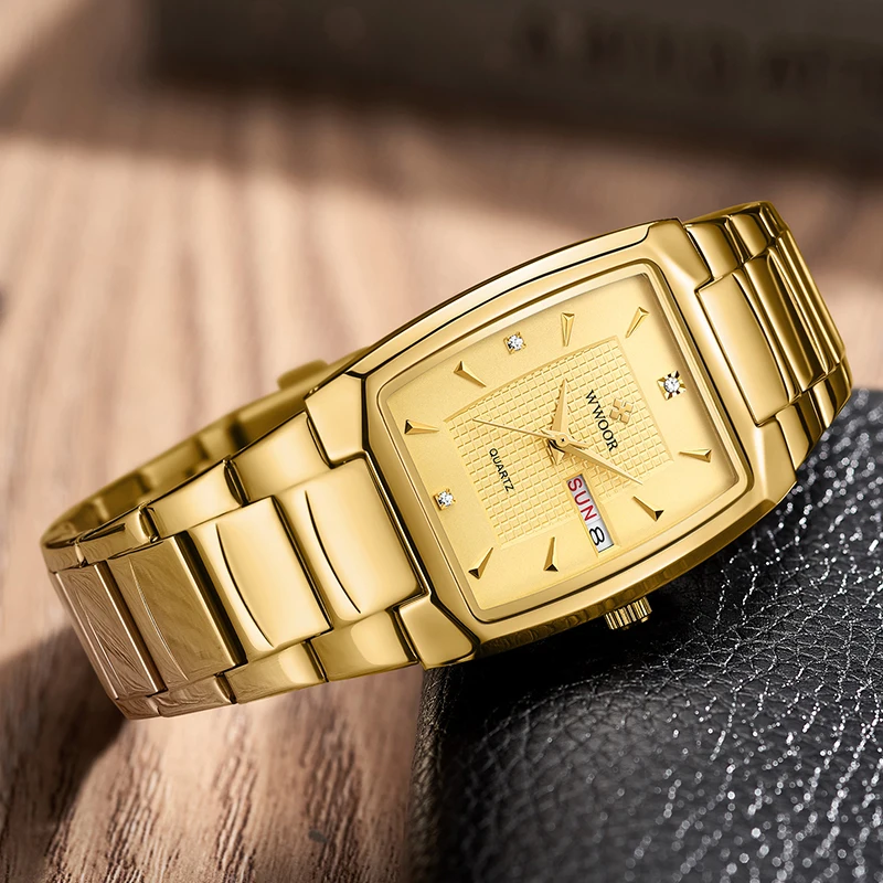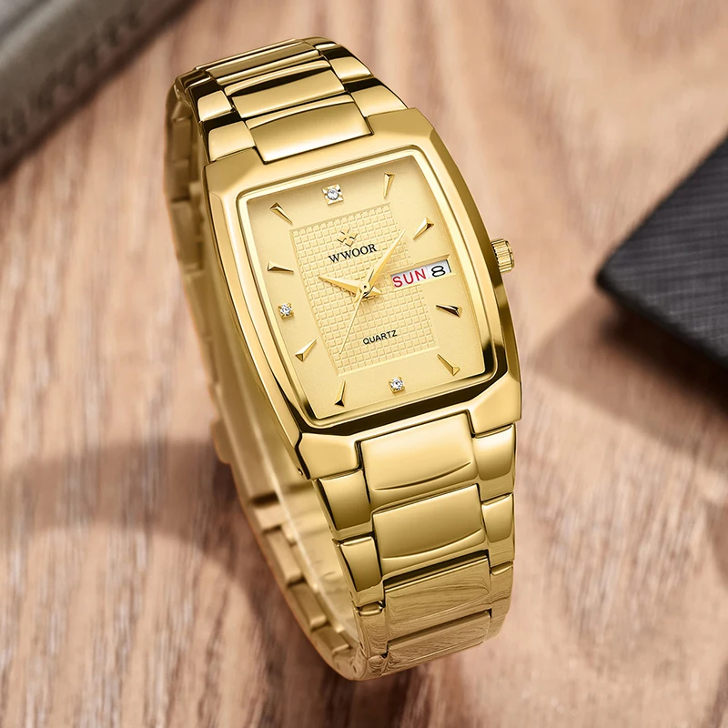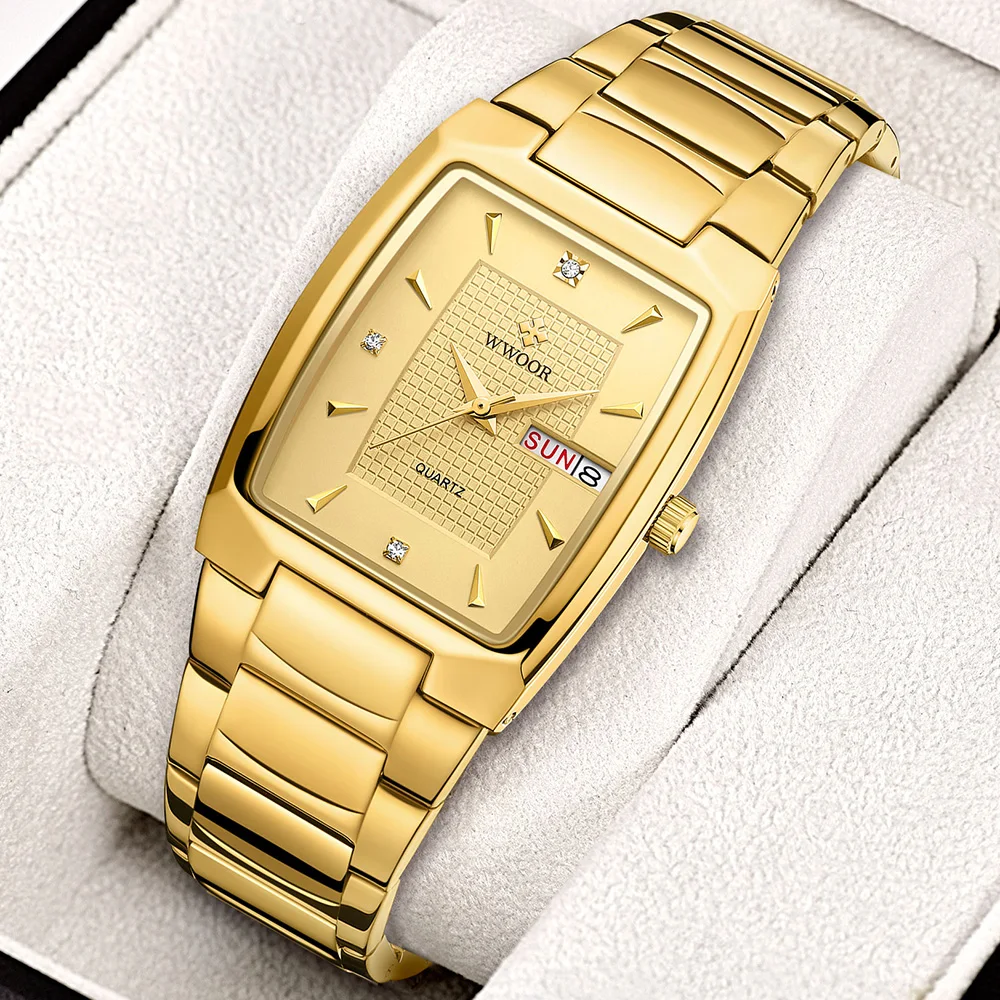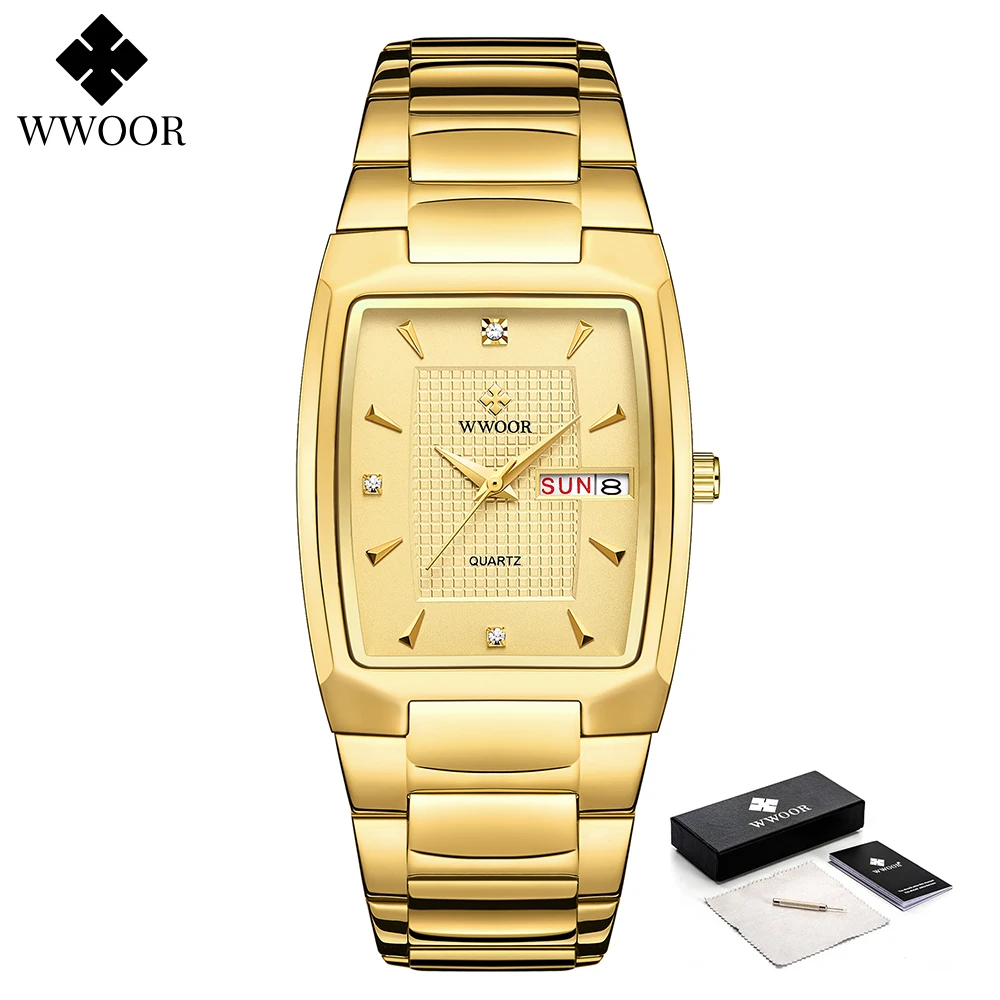 Часы наручные WWOOR Мужские кварцевые, роскошные дизайнерские деловые водонепроницаемые автоматические, с квадратным золотым циферблатом, с датой недели, 2021