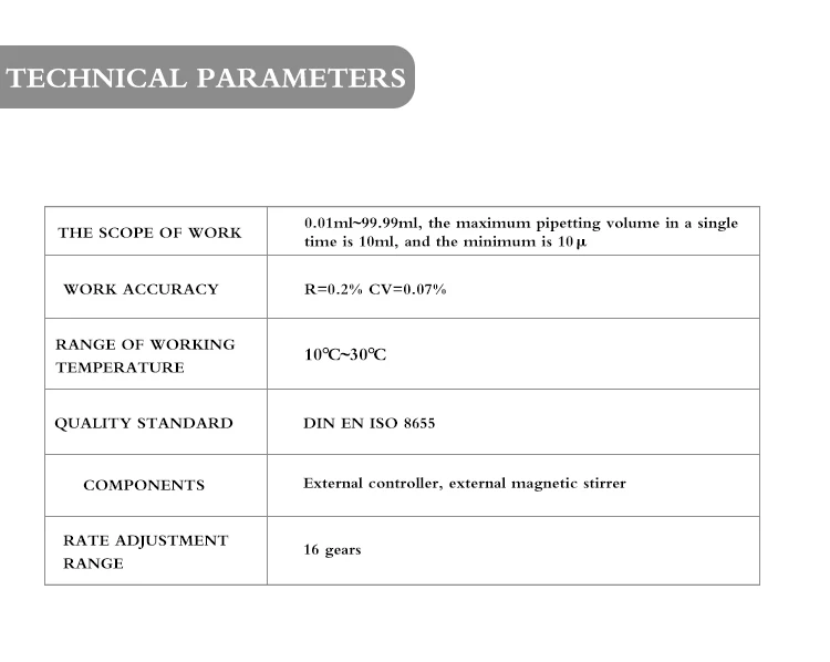 Ключевые особенности• Высококачественный мотор обеспечивает отличную точность и точность• Электронное управление уменьшает повторяющееся деформационное повреждение• Пульт дистанционного управления предотвращает ручной помехи во время работы• Встроенная поддержка магнитной мешалки• Полностью цифровая работа• Электронная система управления делает процесс титрования стабильным и точным• Humanized большой размер ЖК-дисплей настройки параметров интерактивная панель• Можно подключить к компьютеру через usb-интерфейс для управления и сохранения данных