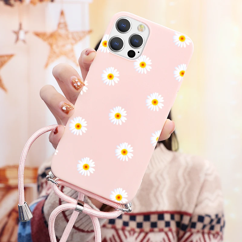 Мягкий чехол из ТПУ для iPhone 13, 11, 12 Pro, Max mini XR, X, XS, SE 2020, 7, 8, 6, 6S Plus, 5 детской, 13Pro Max, чехол с цветочным ожерельем и шнурком