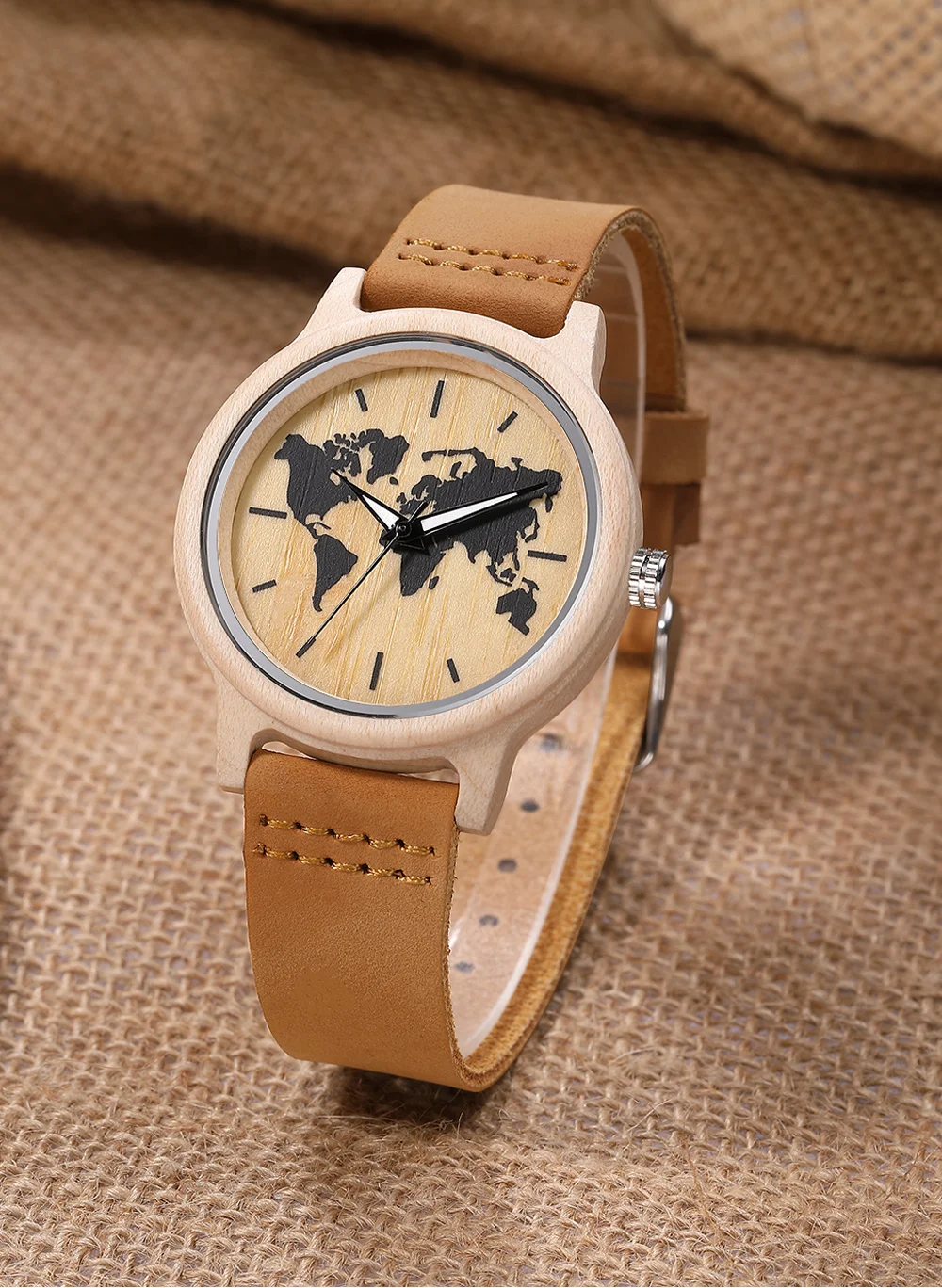 Женские деревянные часы с кожаным ремешком, деревянные часы с изображением карты мира клена и циферблата, светящиеся наручные часы для мужчин