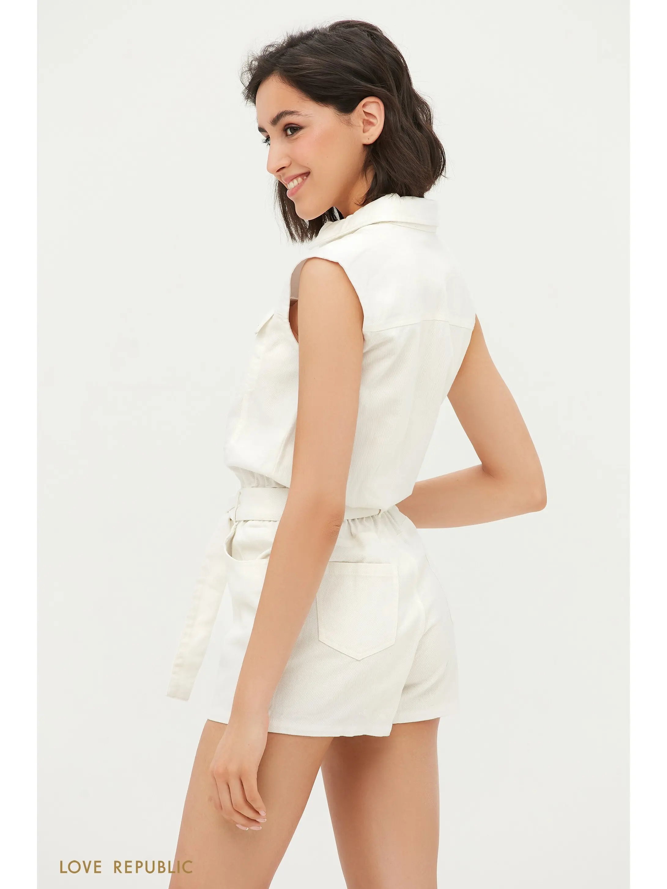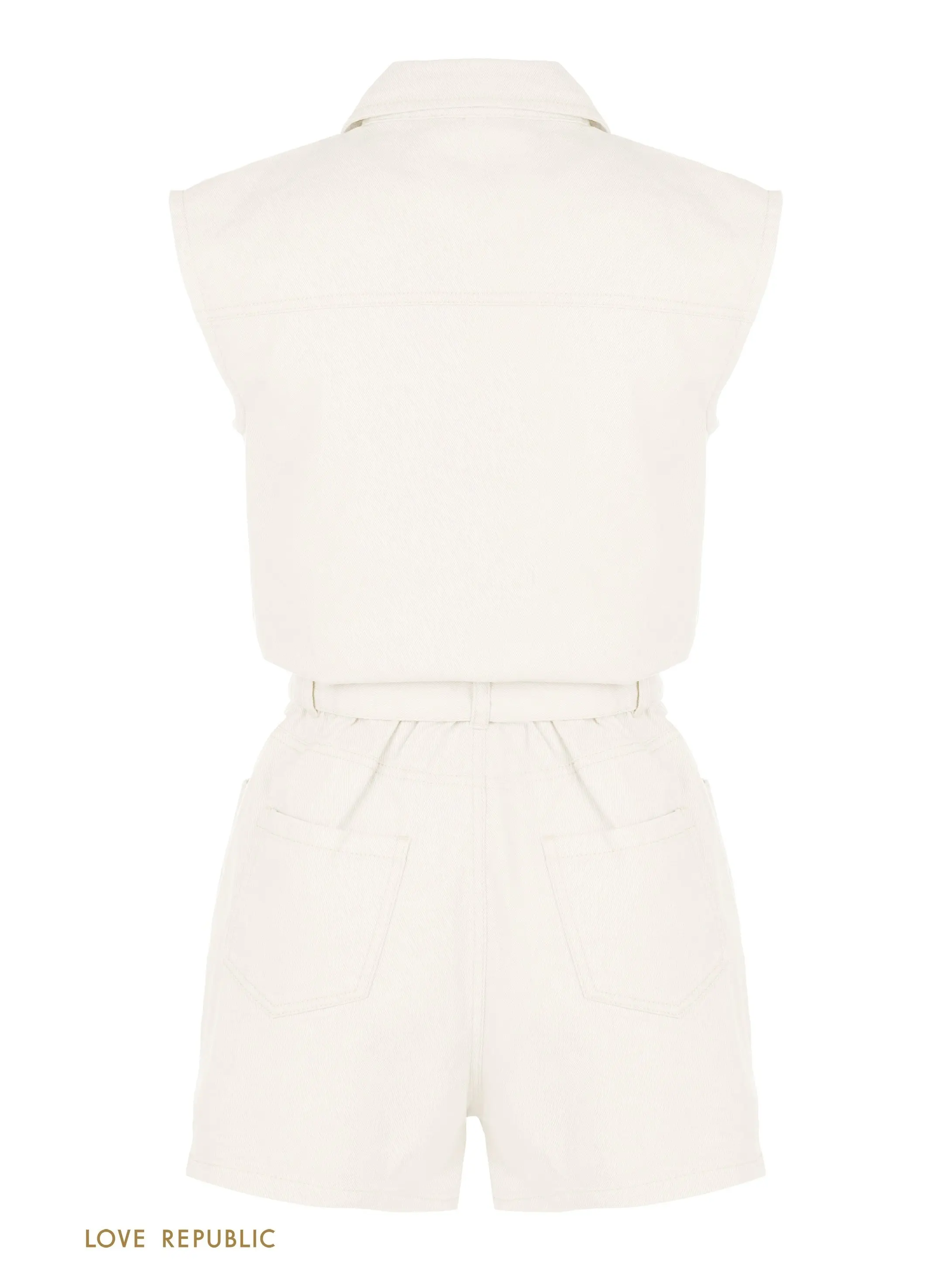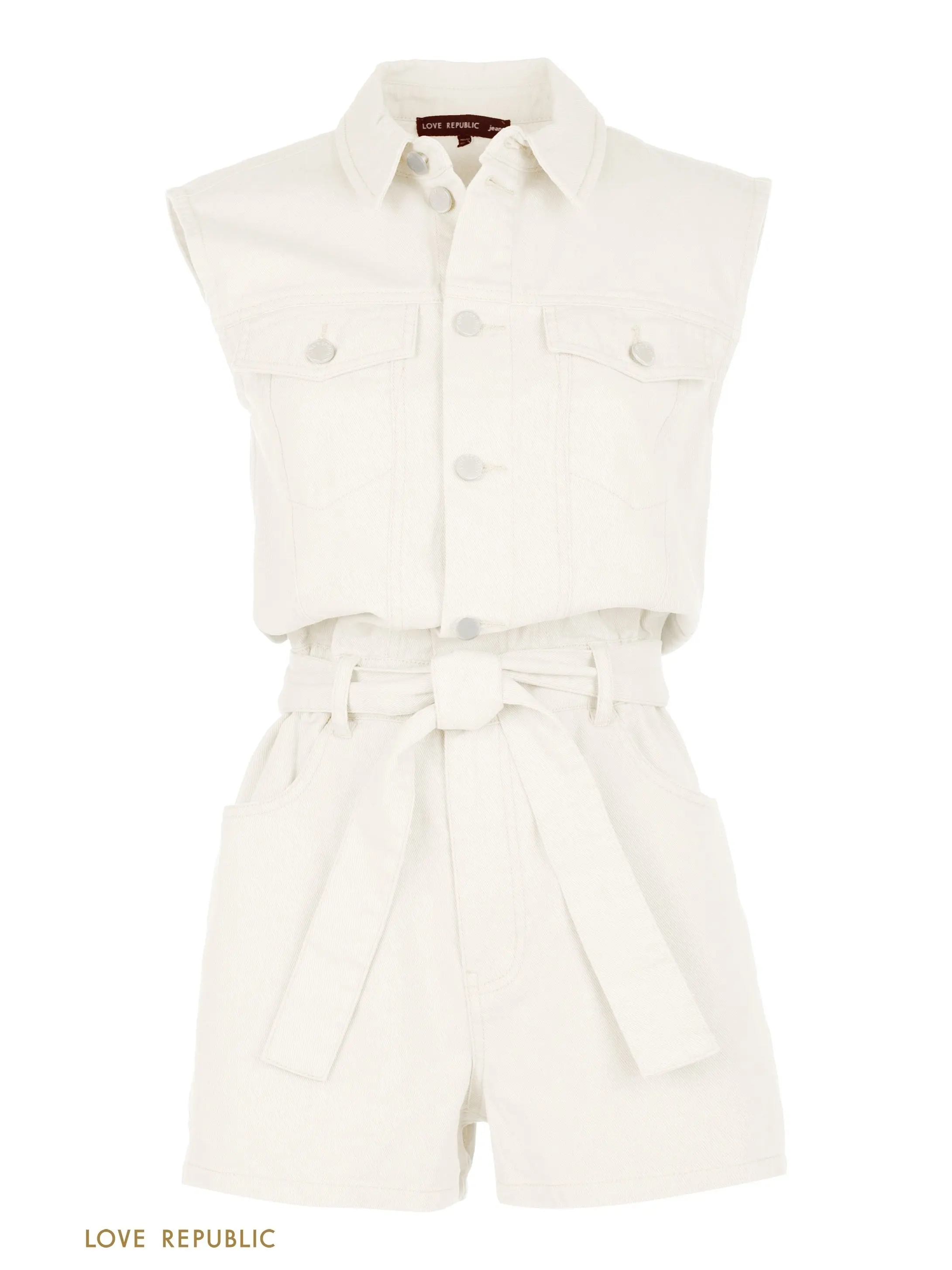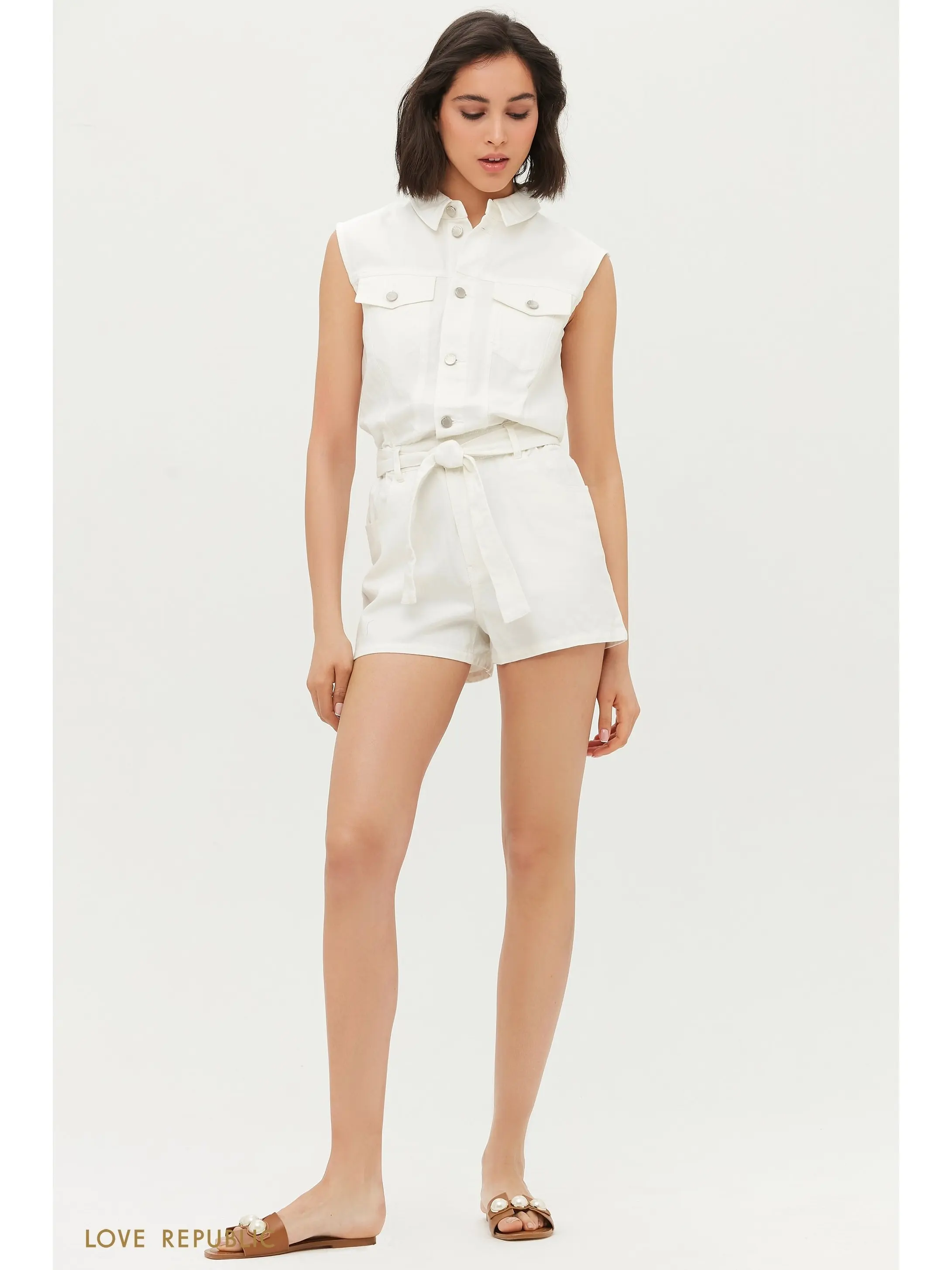 Джинсовый комбинезон с шортами в белом и бежевом цвете. Свободный крой, накладные карманы на груди, отложной воротничок. Резинка по линии талии и съемный пояс подчеркнут фигуру. Модель дополнена функциональными карманами сбоку и сзади. Комбинезон застегивается на вертикальный ряд пуговиц и молнию. Для образа в стиле сафари дополни айтем крупными золотистыми украшениями, обувью на платформе и сумкой с анималистичным принтом. Крой модели соответствует стандартному размеру, обеспечивает идеальную посадку по фигуре. Размер на модели: 42.