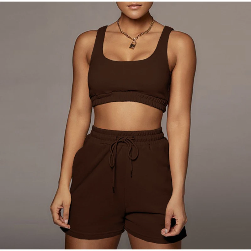 Женский однотонный спортивный костюм, повседневный комплект из двух предметов, укороченный топ и шорты на шнуровке, летний сексуальный комплект для отдыха, 2021