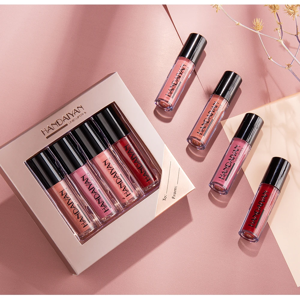 Набор матовой жидкой помады HANDAIYAN, 4 цвета в коробке, женский набор для макияжа, матовая помада, Косметика для макияжа губ, ТИНТ, блеск для губ, водостойкий