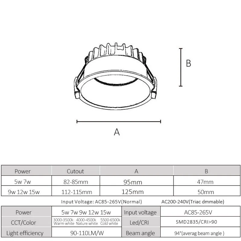 Входное напряжение/нормальный тип: AC85-265V входное напряжение/Диммируемый Тип: AC200-240V Материал корпуса: алюминиевый корпус с защитой от окисления и антикоррозийной окраски Быстрое рассеивание тепла. Продолжительная работа. Угол регулировки луча: 90 градусов. Потребляемая мощность: 5 Вт 7 Вт 9 Вт 12 Вт 15 Вт Светодиодный светильник источник/количество (шт): EPISTAR SMD СВЕТОДИОДНЫЙ люмен (лм): 100-110 лм/Вт рабочая температура. : -25 градусов по Цельсию-+ 50 градусов по Цельсию индекс цветопередачи: Ra >90 Светильник Цвет: холодный белый (6000-6500K) теплый белый (3000-3500K) естественный белый (4000-4500K) тип затемнения: Triac