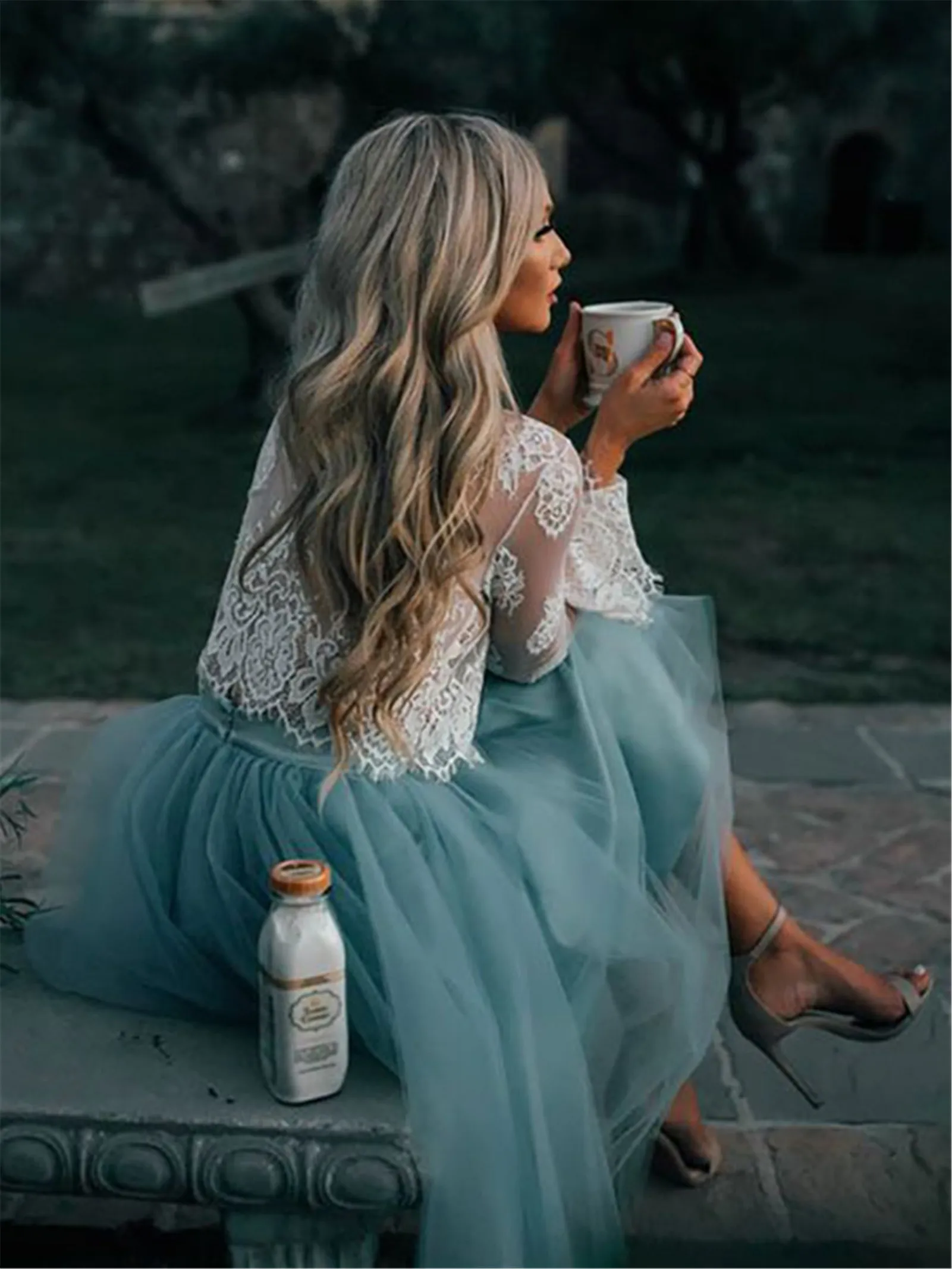 Соблазнительные небесно-голубые кружевные и тюлевые Короткие свадебные платья до колен с длинным рукавом из фатина на заказ в богемном стиле с расклешенными рукавами