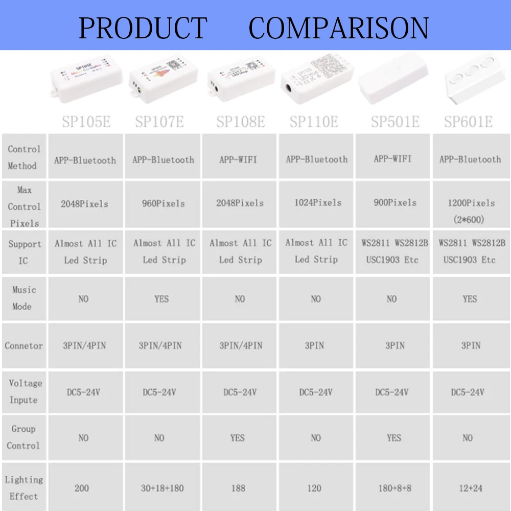Метод управления: APP-WifiВходное напряжение: 5-24 В постоянного токаПиксель: 2048Разъем: 3pin/4pinРасстояние управления: 30 мВес изделия: 40 г;Размер изделия: 85 мм * 45 мм * 22 мм;Поддержка IC: WS2811 WS2812B WS2813 WS2815 WS2818 WS2801 SK6812 P943S P9411 P9413 TX1812 TX1813 SK6812-RGBW SM16703 UCS1903 TM1804 LPD6803 LPD8806 a188806 a8206 a208gs12