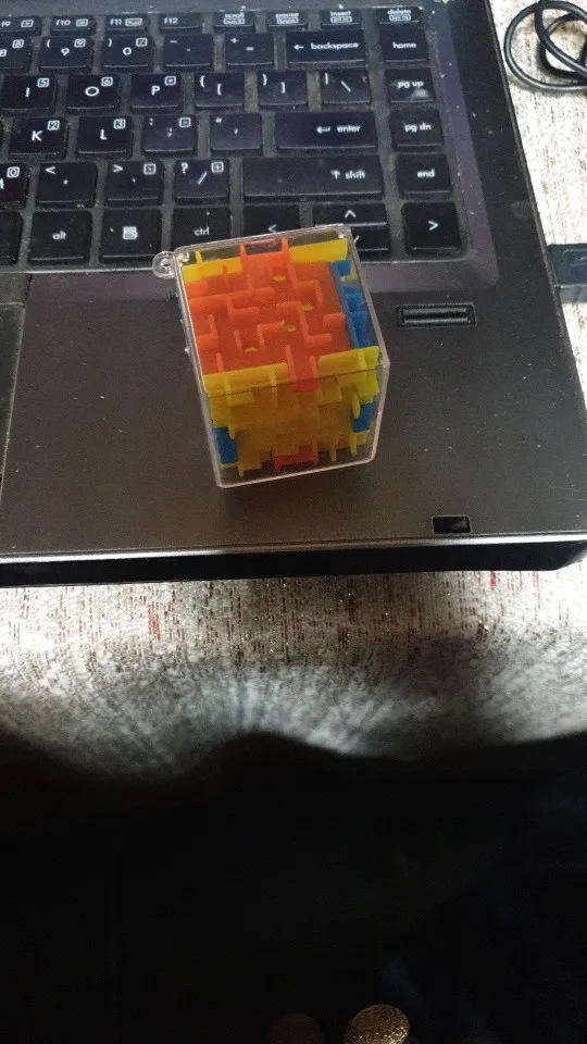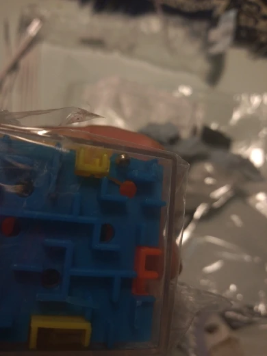 Кубик гранью 3,5 см с петелькой, видимо, чтобы как брелок носить. Думаю, что эта игрушка для минут томительного безделья, потому что там слишком много внутри дырок, в которые проваливается шарик по дороге, что ужасно бесит и хочется выкинуть этот кубик к чертовой матери. Ребенку не дам)