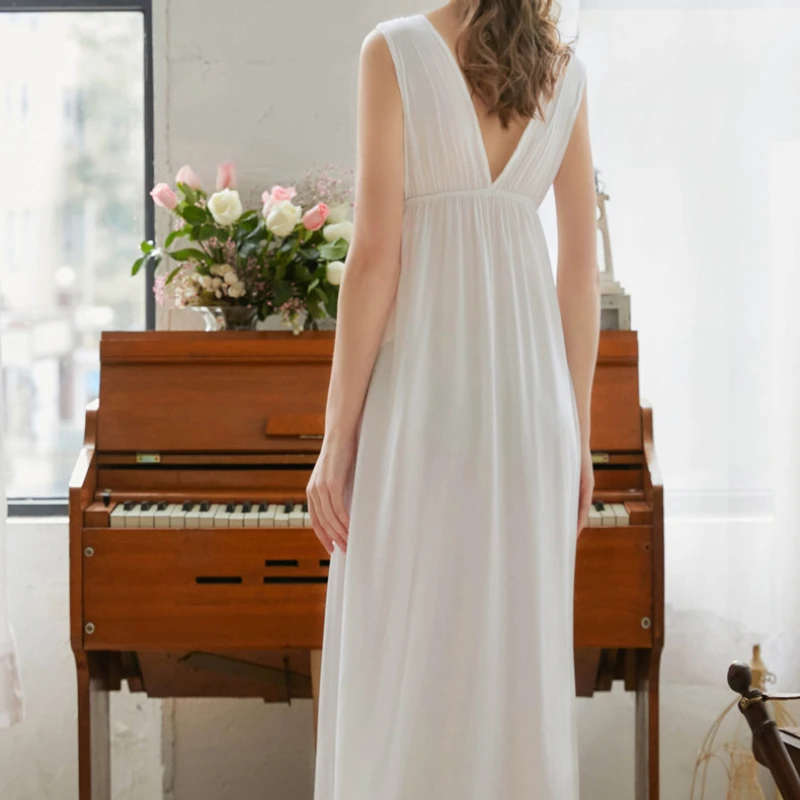 Винтажная белая ночная рубашка, одежда для сна, Женская хлопковая Ночная сорочка без рукавов, Сексуальная кружевная ночная рубашка с V-образным вырезом, Длинный пеньюар для принцессы, Ночная одежда