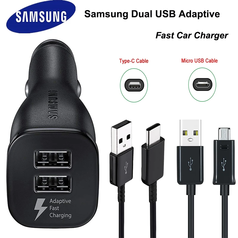 Автомобильное зарядное устройство Samsung, 2 USB порта, кабель Micro USB –Type-C, чёрное/белоеОсобенности товара:-SAMSUNG Dual USB адаптивный Быстрый автомобильный адаптер зарядного устройства-Выход: 5 В/2 а 9 В/1,67 А (оба порта USB поддерживают порт быстрой зарядки)-- Подходит для Samsung Galaxy S4 S6 S7 Edge S10 S8 S9 Plus Note 4 5 8 9 10 10 + J1 J2 Pro J3 J5 J7 A3 A5 A7 2016 2017-- 100 см Micro USB кабель для передачи данных/120 см TYPE-C кабель