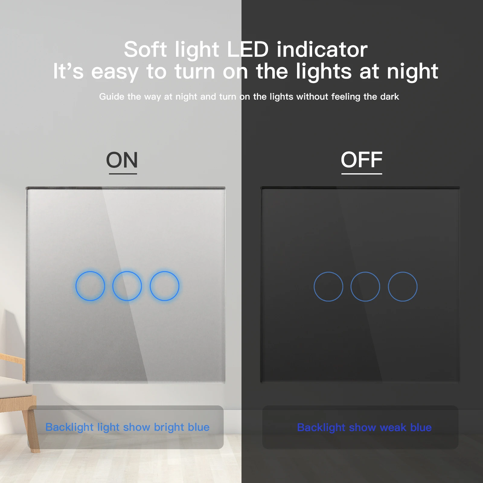 A:Синяя подсветка будет включаться, когда проводка пройдет успешно. Позволяет вам четко заметить наш сенсорный выключатель в темноте.