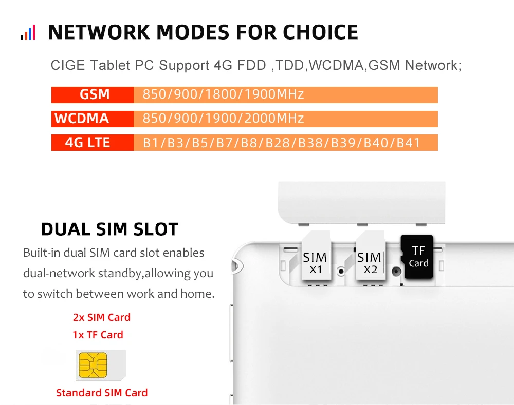 Планшетный ПК CIGE работает в сетях 4G и поддерживает голосовые вызовы VoLTE.С помощью мобильного Интернета 4-го поколения вы можете использовать планшет для чтения книг, воспроизведенияGames. surf social networks и смотреть видео онлайн в любое время и в любом месте.