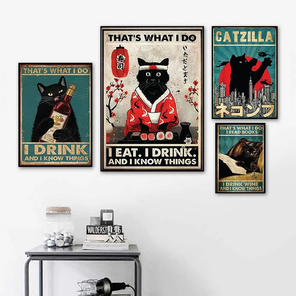 Плакат с черной кошкой, это то, что я делаю, Художественная печать в винтажном стиле, я ею и пью, и я знаю вещи, Картина на холсте, кухонный Декор для дома