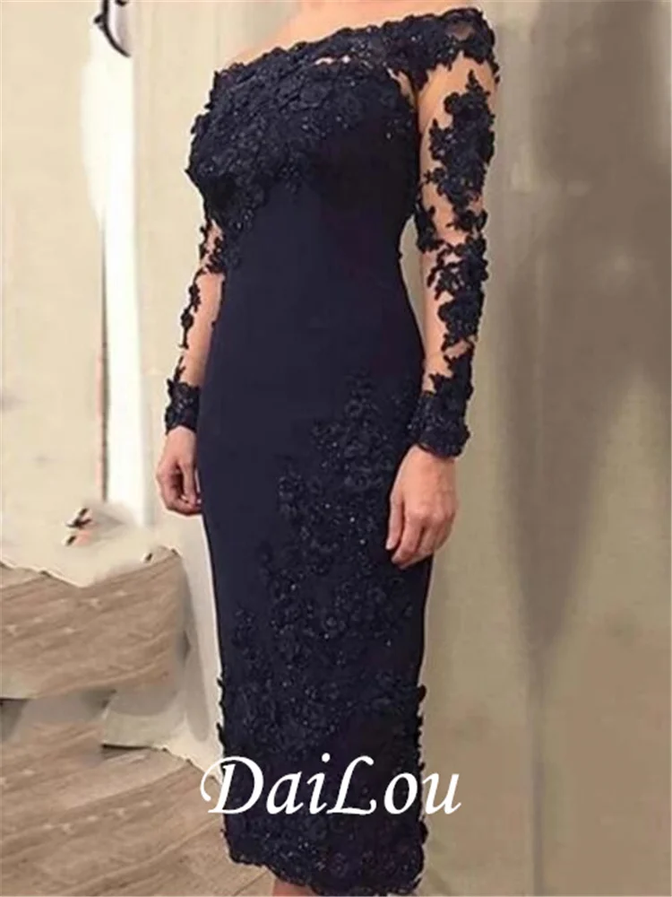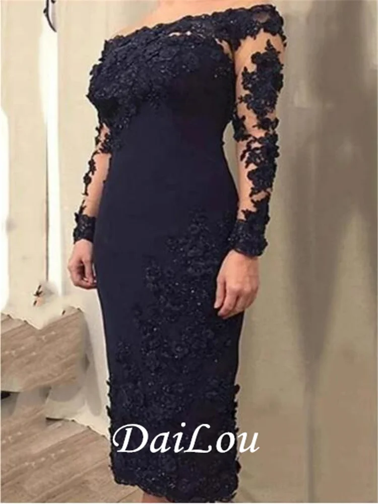 Платье-футляр для матери невесты, элегантное кружевное Атласное Платье До Колена, с открытыми плечами и длинным рукавом, с аппликацией, 2021