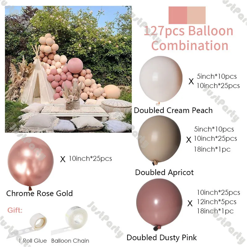 102 шт (10 футов)Шар гирлянда Арка Упаковочный лист:Крем-персик в два раза (5 дюймов * 10 шт., 10 дюймов * 20 шт.)Абрикосовый (5 дюймов * 10 шт., 10 дюймов * 20 шт., 18 дюймов * 1 шт.)Двойной пыльный розовый (10 дюймов * 15 шт., 12 дюймов * 5 шт., 18 дюймов * 1 шт.)Хромовое розовое золото 10 дюймов * 20 штБесплатно: 1 рулонный клей (100 шт.)Воздушная цепь * 1(5 м)