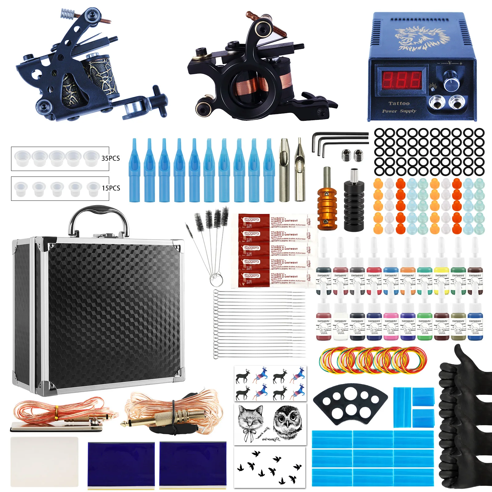 ЖК-дисплей Supplyx1Доллар тату машина для Shadingx1Металлическая тату машина для Liningx110 шт иглы татуировки (5RL, 5M1)x24 шт. наконечники татуировки из нержавеющей стали (5R5F)x16 шт. тату аксессуаров x1Большие чернила для тату Cupsx20Белая татуировка для тренировки кожи x1Бумага для переноса татуировок x2Зажим Cordx1Педализатор для ног x1Тату Gripx1Одноразовые Glovesx4После сливок X5Татуировка Cuos чернила Holderx1Золотые Нескользящие алюминиевые тату-ручки x1Маленькая птичка Tatto Stickerx1Олень Tatto Stickerx1Стикер сова Татто x1Зажим для шнура Coverx2Чехол для тату-машины x10Татуировочная щетка x120 шт тату Inksx1Алюминиевый комплект татуировки Boxx110 шт одноразовые иглы (5R, 5F)x1