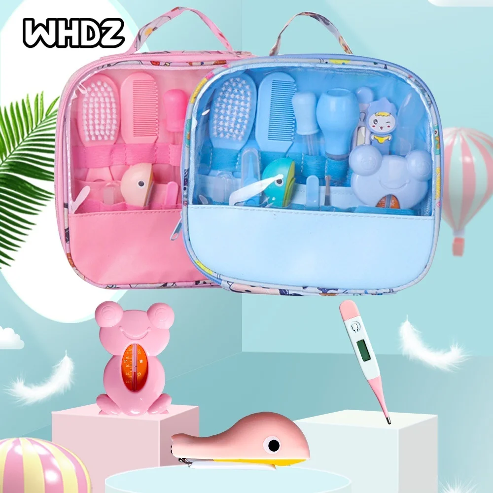 13 шт. в одной упаковке 1x очиститель для носа с чехлом 1x ушной фонарик 1x зубная щетка для пальцев 1x Мягкая щетка для волос 1x Детский термометр 1x машинка для стрижки ногтей 1x Пинцет 1x ножницы с круглой головкой 1x расческа для волос 1x Детская мерная ложка 1x пилка для ногтей 1x кормушка для малышей 1x термометр для воды с лягушкой