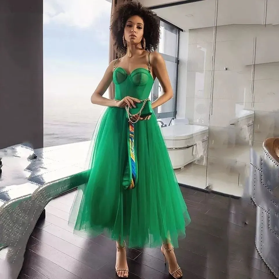 Элегантные зеленые платья для выпускного вечера длиной до середины икры, ночные платья на бретелях-спагетти, вечернее платье, бальное платье на выпускной