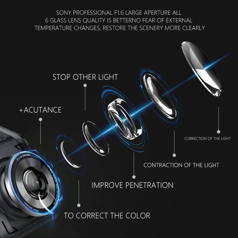 С революционной супер Ночное видение Технология, Автомобильный видеорегистратор может захватывать четкое видео и фотографии даже в условиях низкой светильник ночное время суток. F/1,8 крупнейших диафрагма в наличии + 6-Стекло Широкий формат объектив с фирменными фокусное Длина объектива дает вам более четкие мелких деталей N/B: Ультра низкий светильник обеспечивает четкое изображение даже в полной темноте!