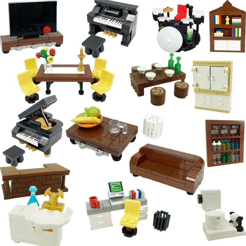 Совместимые строительные блоки для города, кирпичи, кровать, диван, пианино, компьютерные детали, мебель для дома, кухонная модель, аксессуары, наборы, детские игрушки