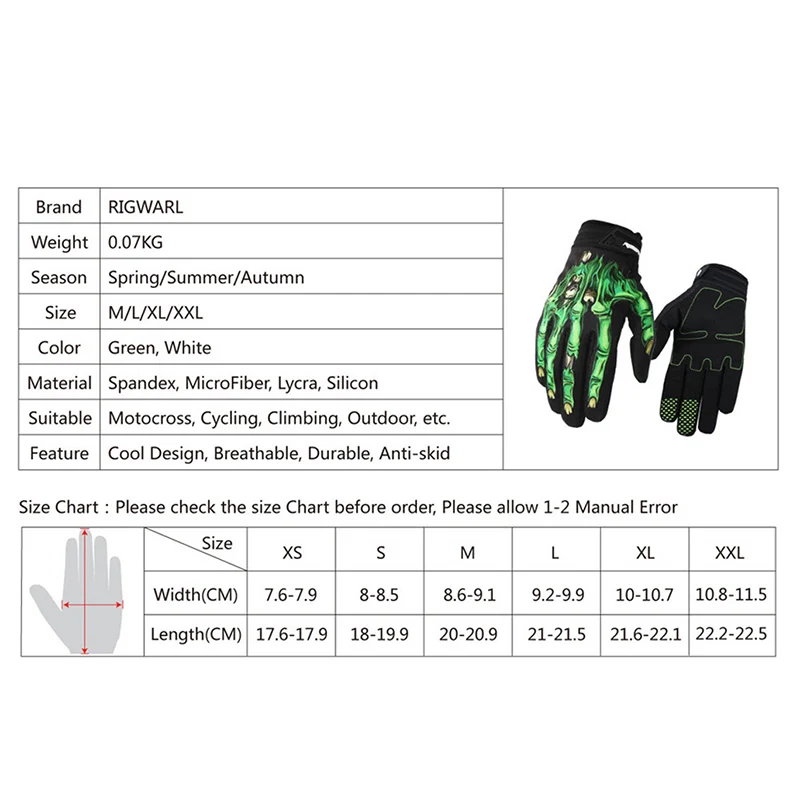 Описание* Уличные спортивные перчатки для мотокросса* Усиленная ладонь, чувствительный датчик на ручке, позволяющий крепко держать ручку.* Силиконовая печать на кончиках пальцев для противоскользящего захвата* Эластичная и дышащая ткань* Регулируемый ремешок* Яркая сублимационная печатная графика