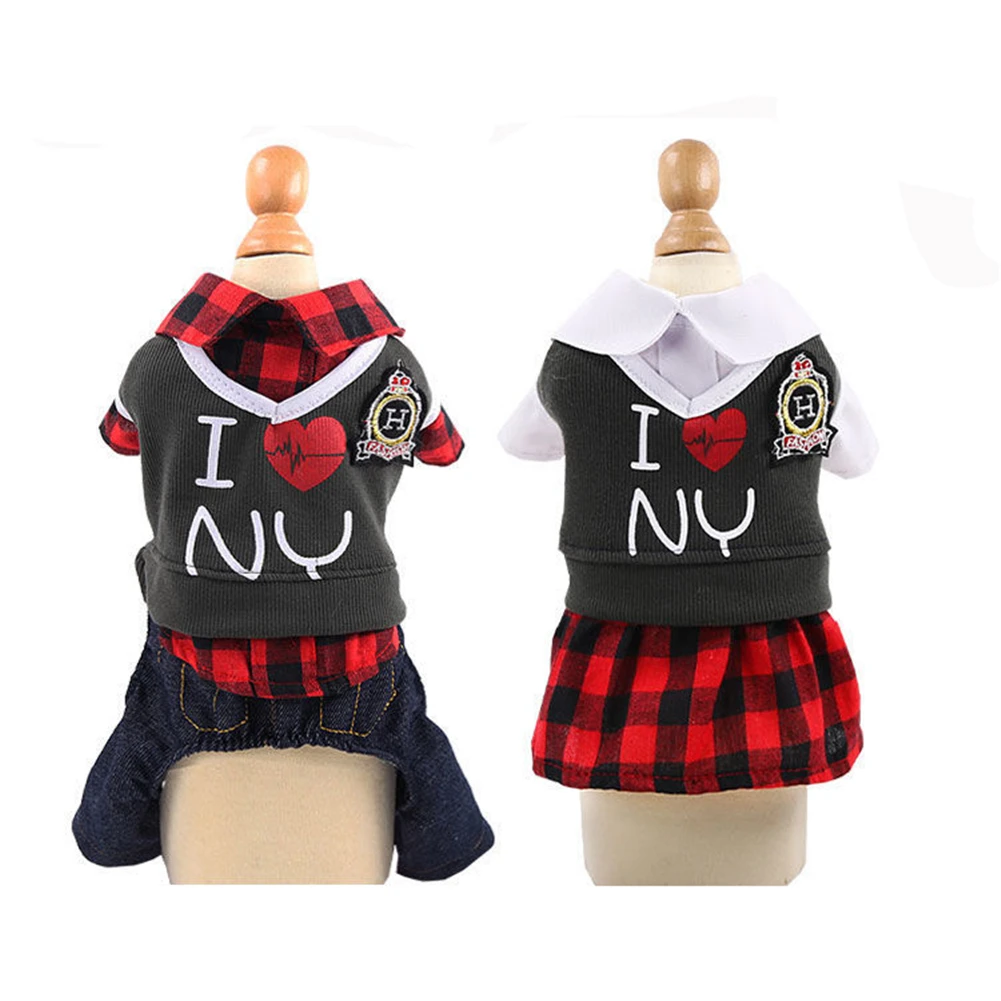Клетчатая рубашка с джинсовыми штанами, жилет, комбинезон для собак, Осень-зима, Модный комплект одежды для маленьких и средних животных, чихуахуа Йорки