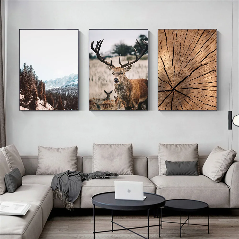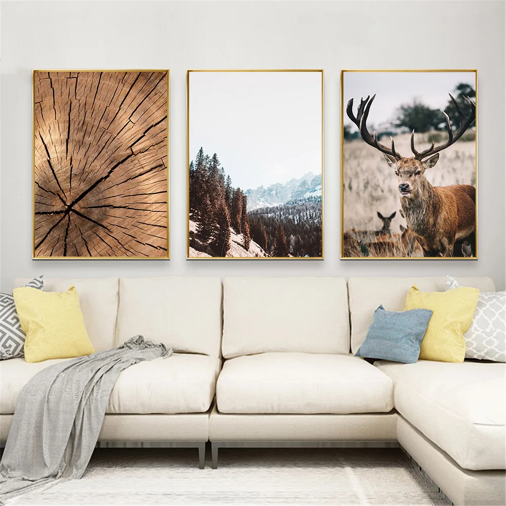 Настенный постер с изображением леса, гор, дерева, пейзажа, семьи с животными, оленями, Картина на холсте, деревянное кольцо, настенные картины, декор для гостиной