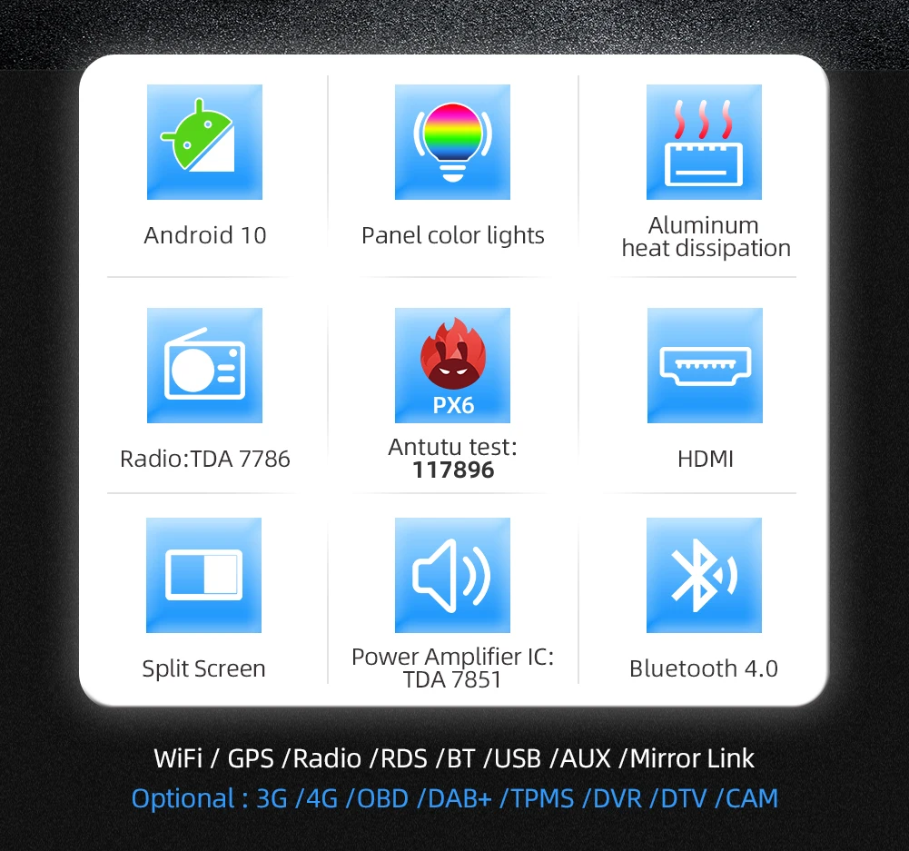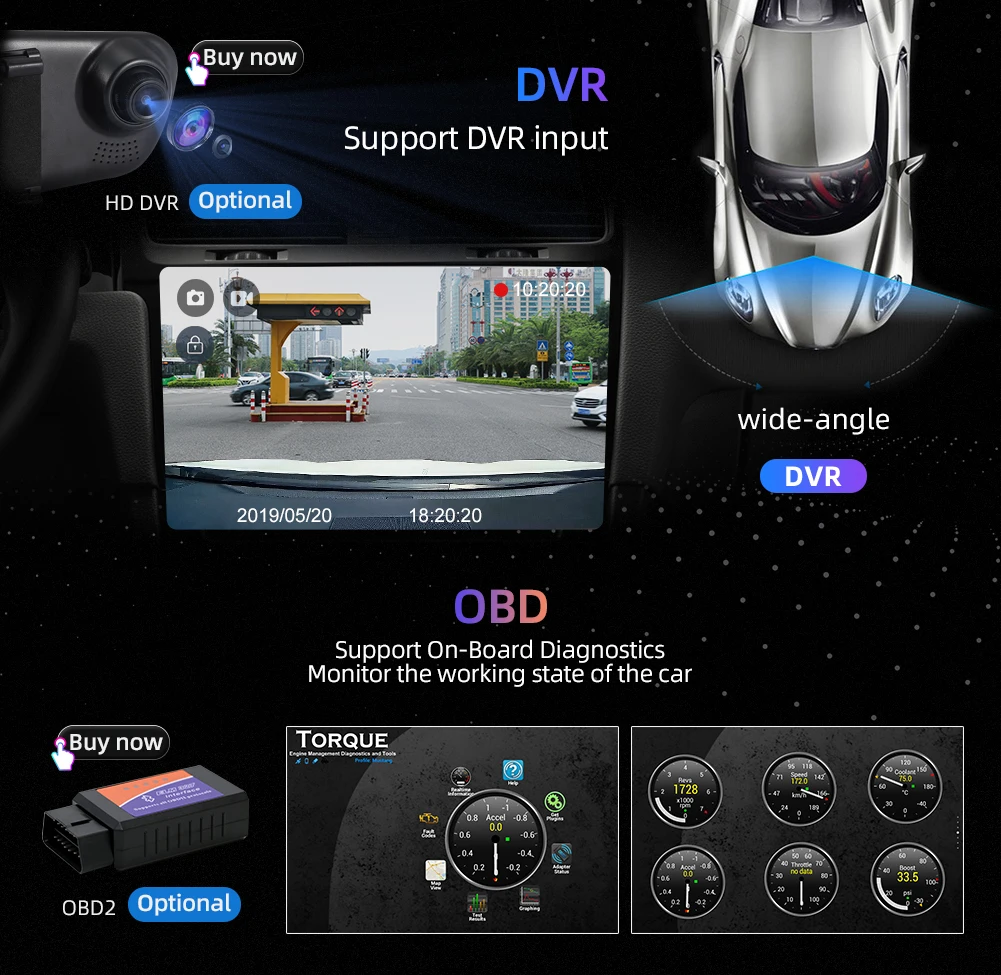 OBD/DAB/3G/4GSupport(OBD scanner,DAB box,(3G/4G dongle optional)
