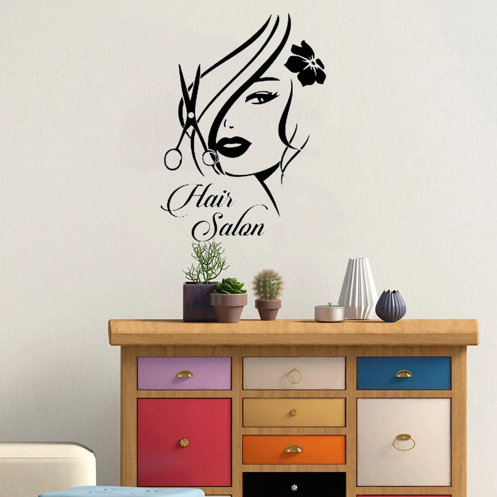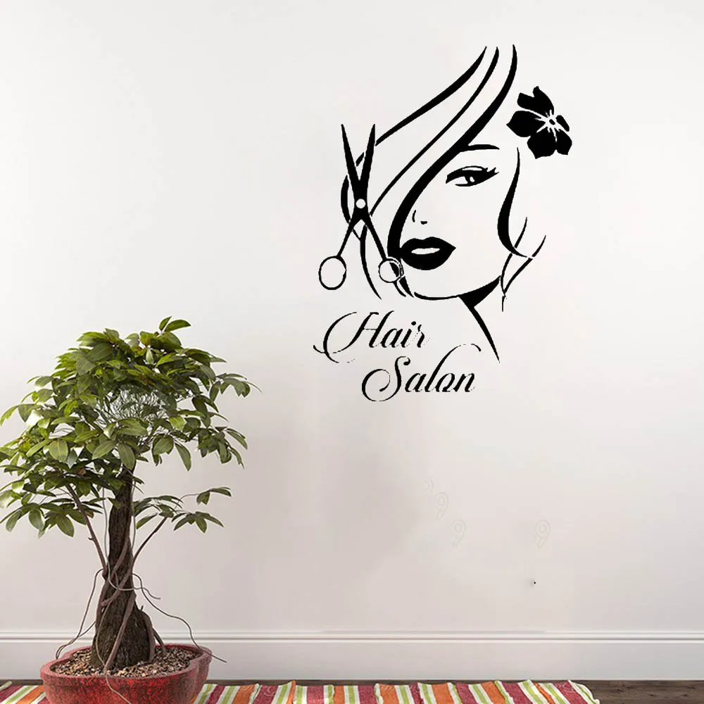 Наклейки настенные виниловые DW7856 для украшения дома, стильная с логотипом девушки и девушки в стиле парикмахерской, художественная наклейка с ножницами для стрижки