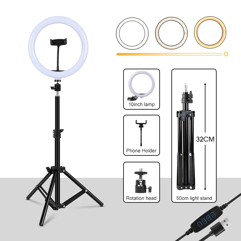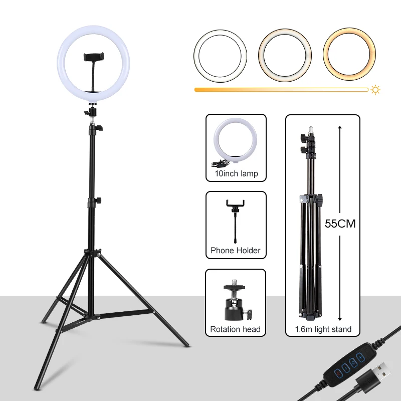 10-дюймовый usb-кольцевой светильник для селфи с подставкой для штатива, держатель для телефона 10 Вт 3200-5500 к, светодиодный светильник с регулируемой яркостью для фотосъемки