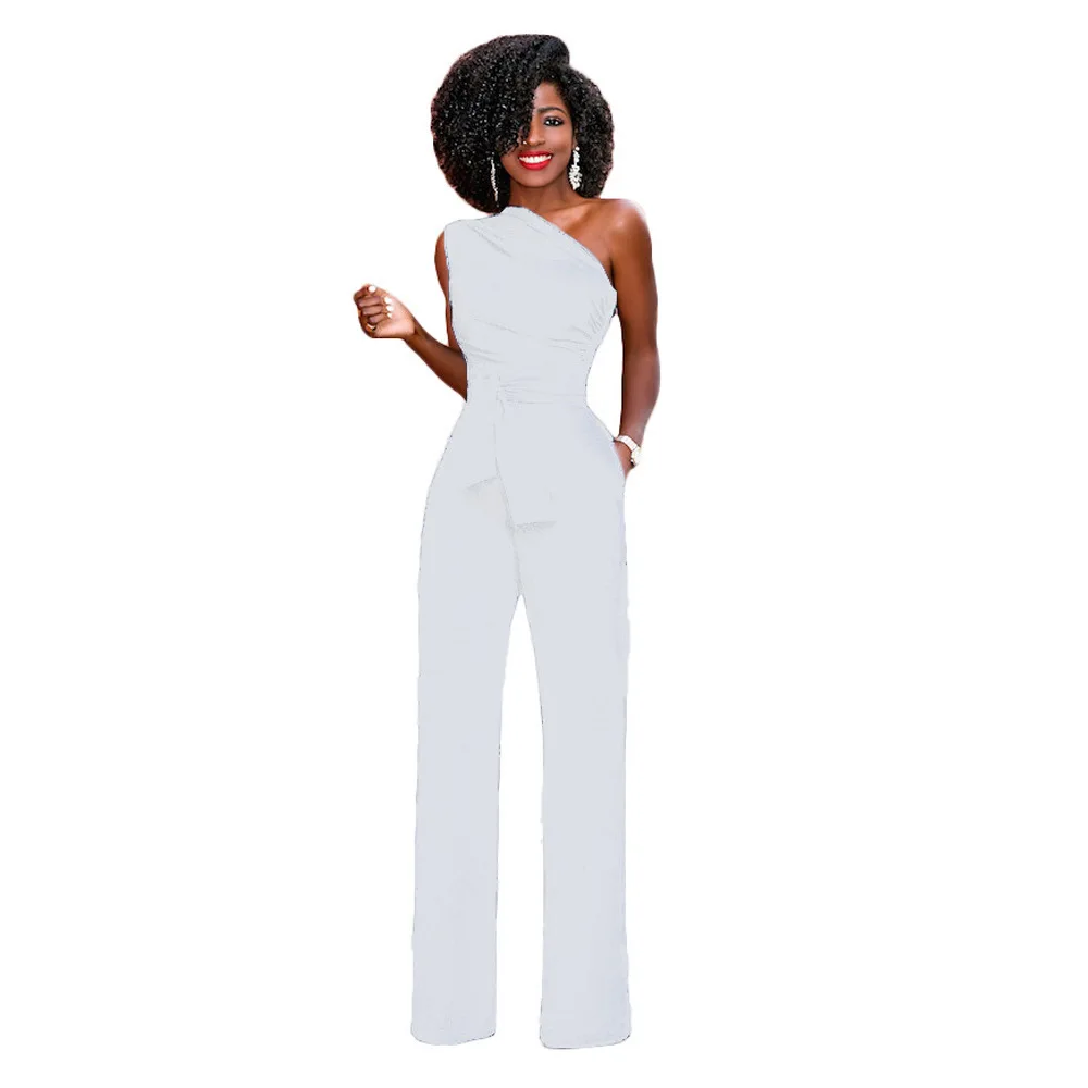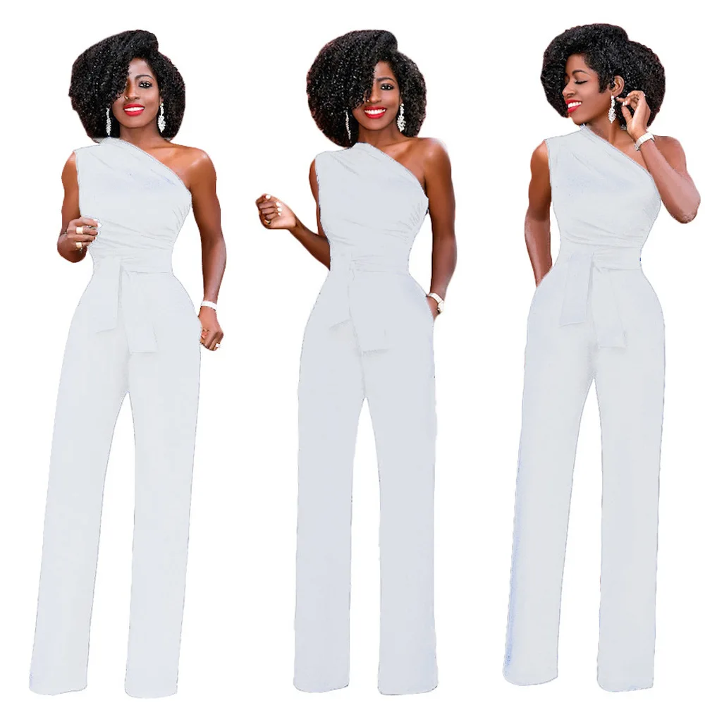 Женский однотонный комбинезон, короткий топ с косым воротником, прямые брюки с поясом, сексуальные свободные брюки без рукавов, Элегантные Очаровательные комбинезоны 2021