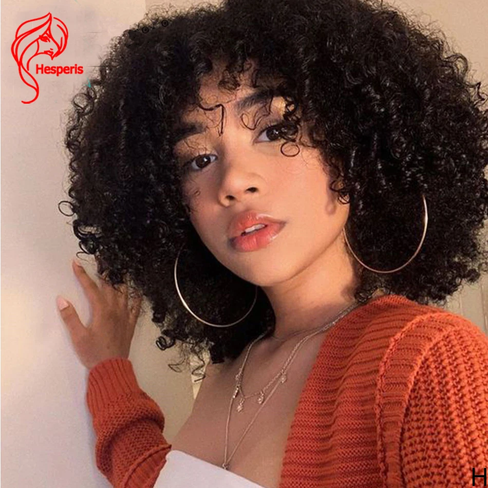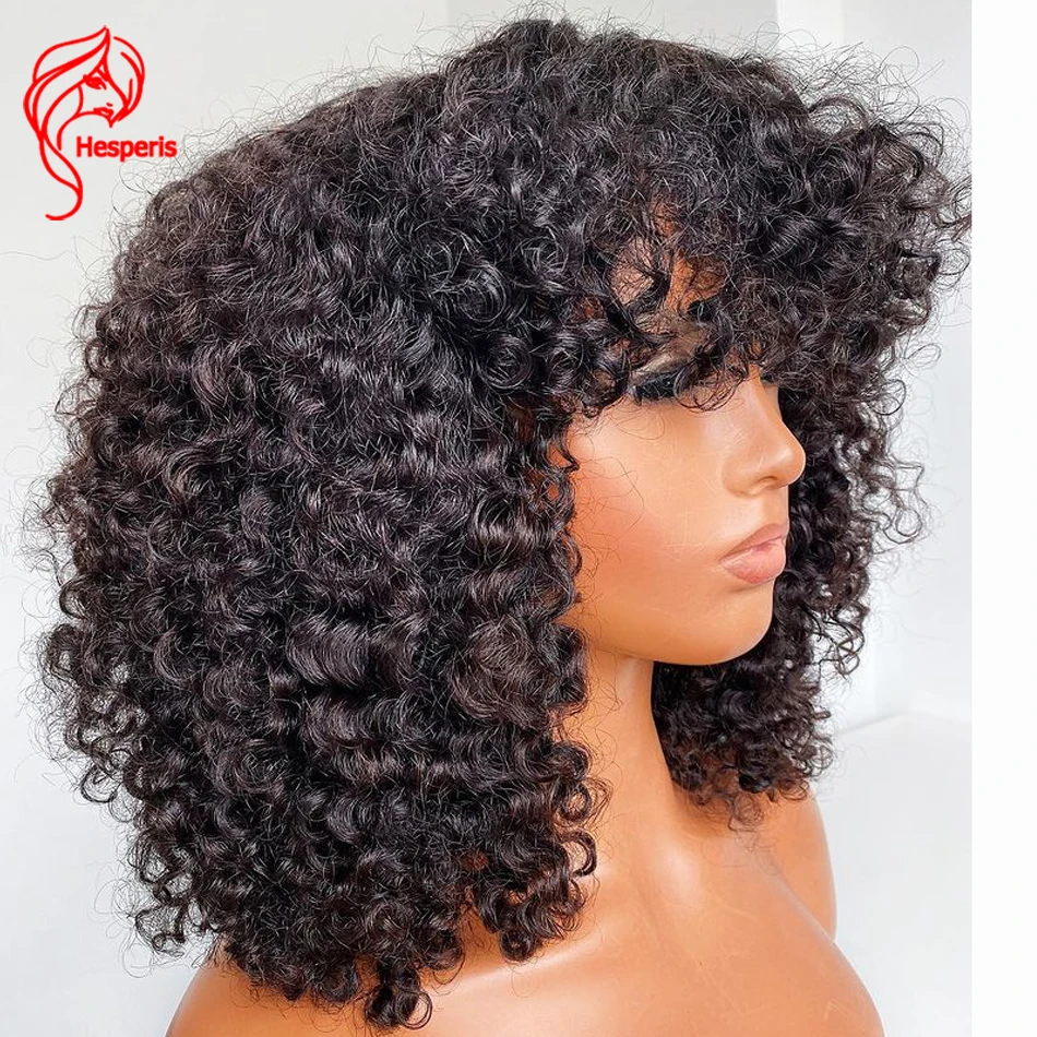 Hesperis 200% плотность афро кудрявые вьющиеся человеческие волосы парики с челкой без клея короткие бразильские Remy человеческие волосы машина сделал парики