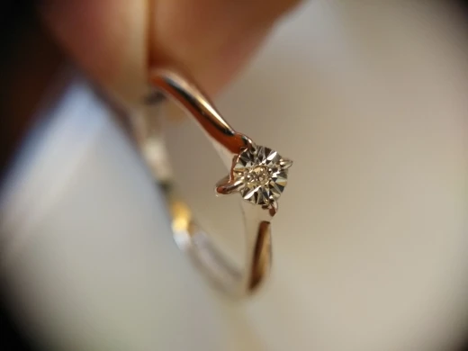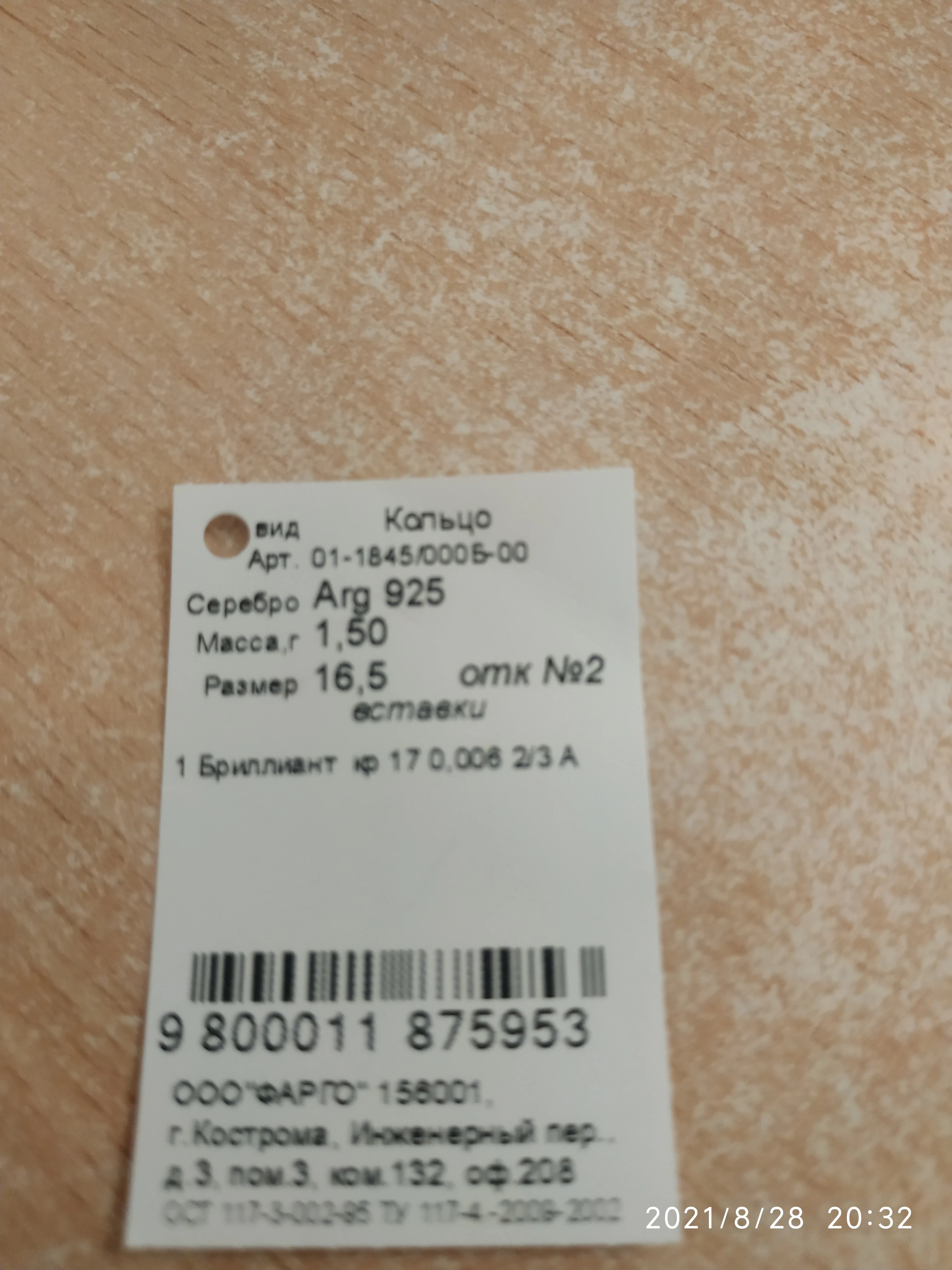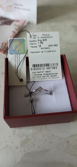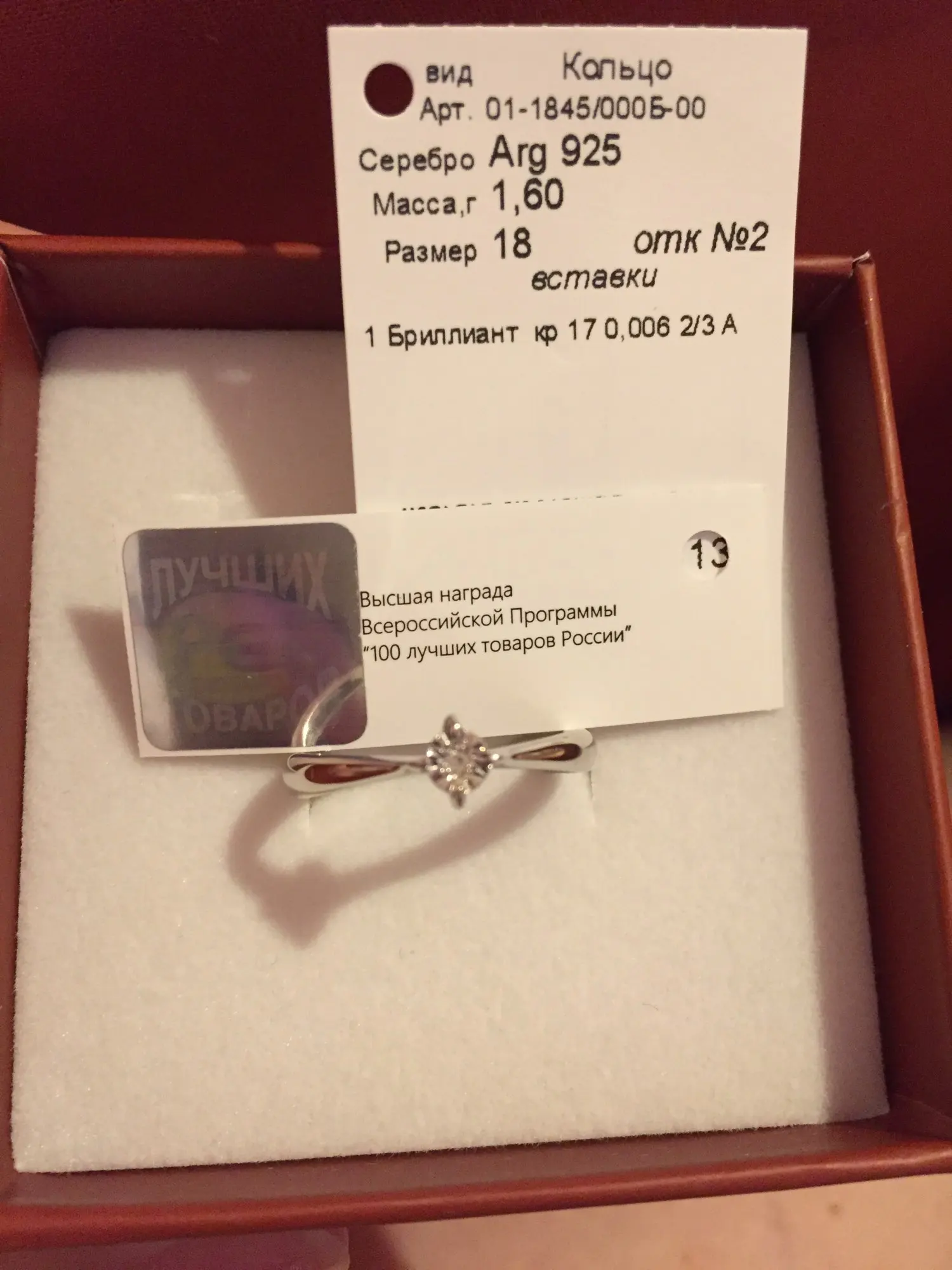 Отличное, нежное колечко! Пришло быстро, первым классом на почту. Проба на кольце стоит, вставка бриллиант - греет душу, каратность бриллианта на бирке указана. Только из-за того, что граней в нём не как в классическом дорогом камне 57, а всего 17, камень не блестит, как положено, и он очень маленький и утопленный в металл, плохо отражает солнышко, сам его не "ловит". Ну, потому что такая огранка. А сам факт того, что " у меня есть кольцо с бриллиантом " - вот для чего можно приобрести это изделие, для тех, кто не обременëн большими деньгами. Жить стало чуточку веселее. В подарок по акции шла ещё подвеска из серебра со вставкой из фианита. Красивая. Магазин - производитель крупный и известный, г. Калуга. С акциями кольцо мне вышло меньше тысячи рублей.