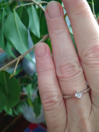Очень нежное колечко. Бриллиантик совсем крошечный, но засчёт лазерной обработкой вокруг него, смотрится очень даже не плохо.блестит, периливается. Доставка очень быстрая. Заказом довольна. Спасибо. Буду заказывать ещё. Выбор большой, глаза разбегаются.