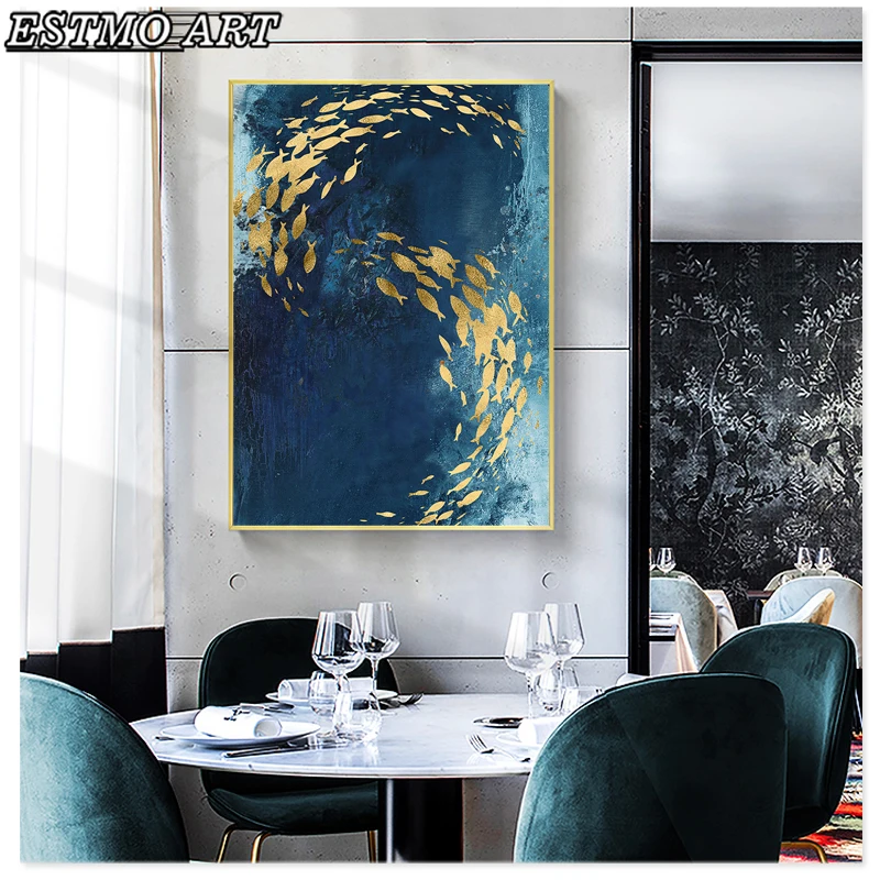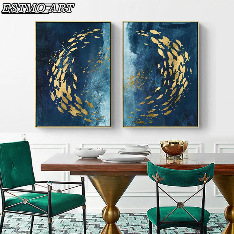 Абстрактная Настенная картина синего и зеленого цветов на холсте постер с изображением золотой рыбы группы и принты скандинавский океанский пейзаж украшение гостиной